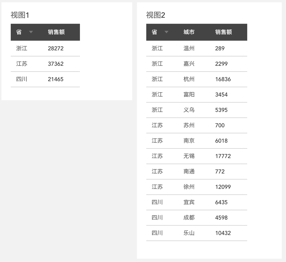 2、视图:数据库技术里有对视图的定义,本文中,可以先简单地把视图理解为一个图表,如下图所示就是两个不同粒度的视图,视图1 细化到省,视图2细化到城市,视图2的细化程度更高,数据更明细,包含的信息也更多: