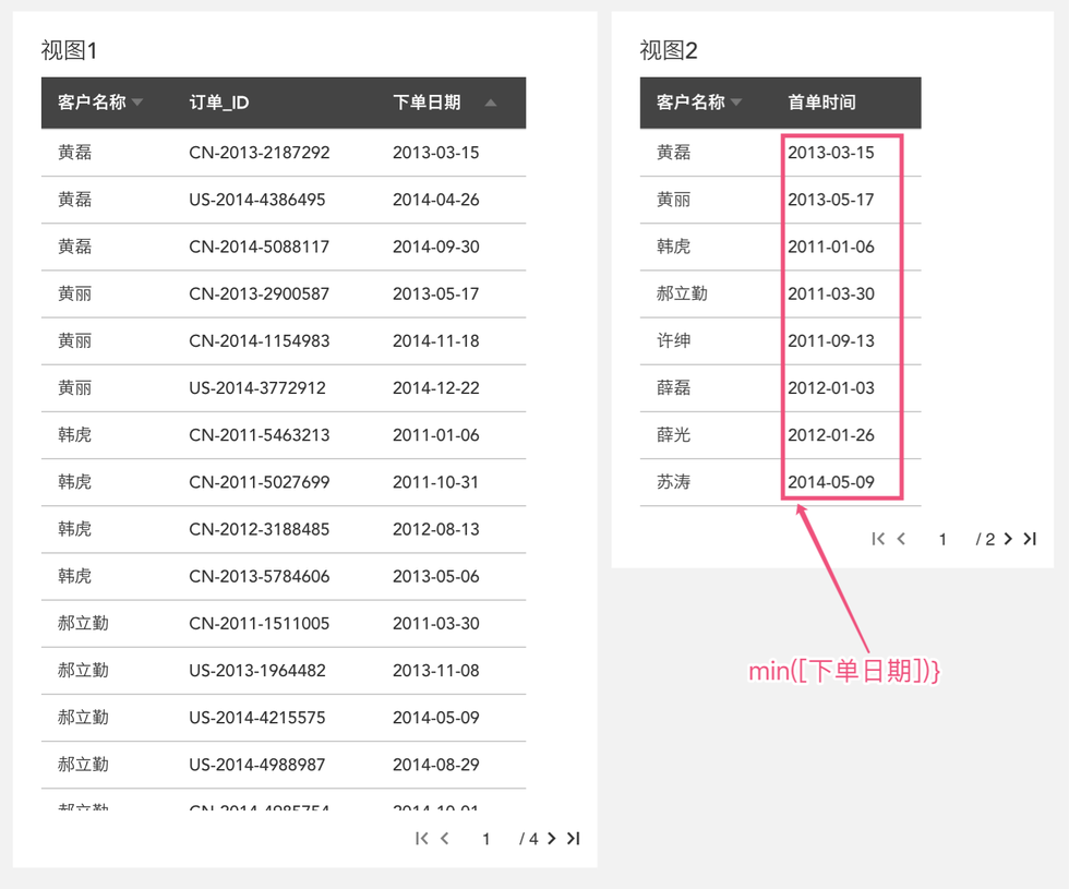 { FIXED [客户名称] : min([下单日期]) }