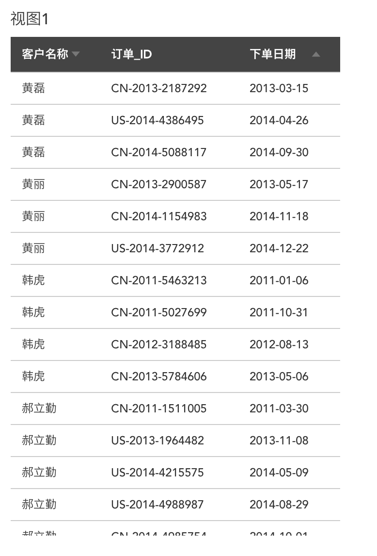 例2:再举一个跨视图粒度计算的例子来帮大家理解,假设我们有这样一个视图,记录客户每个订单发生的时间,粒度细化到每个订单: