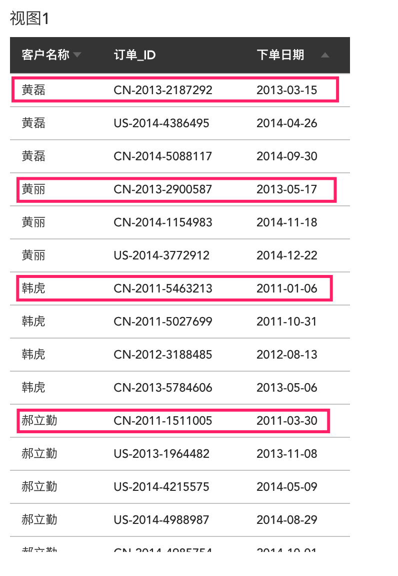 这时候,如果我想给每个订单打个标签,标记这个订单是否是新客户的首单(一个新客户下的第一单就被认为是首单),如图中标出的几个订单: