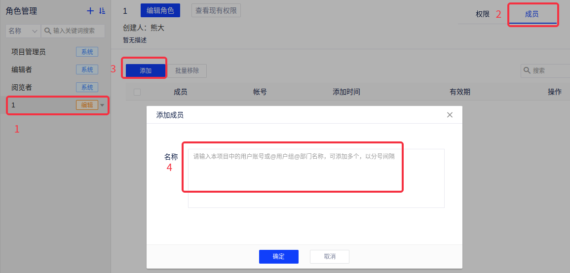 - 编辑角色为自行添加的角色,门户资源新增和编辑权限默认不勾选,您按需配置即可;角色配置完成后在成员项目中添加用户。
