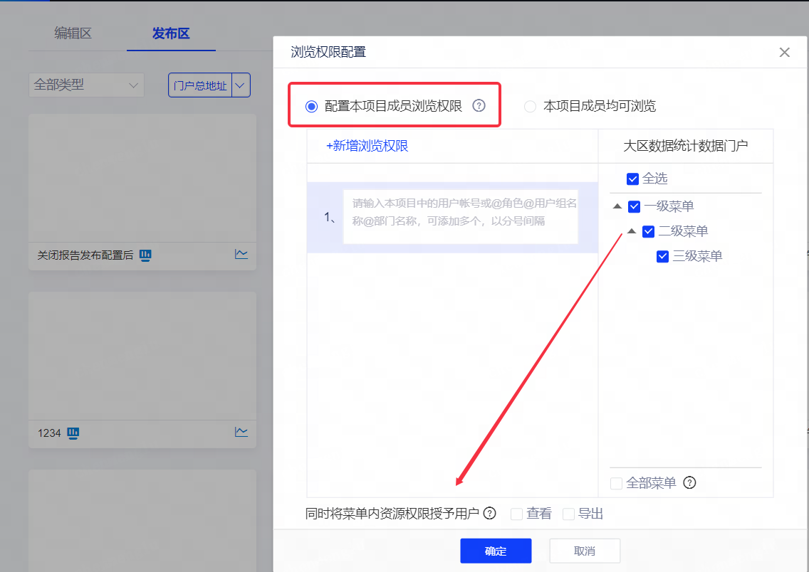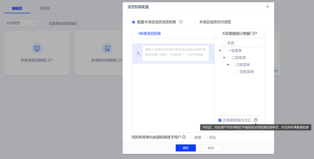 (5)数据门户支持配置“给用户显示无权菜单”。点击门户发布按钮后,编辑者可在浏览权限设置弹窗内,右侧菜单栏【全部菜单】下方新增【无权限菜单显示】勾选无权限仍可见