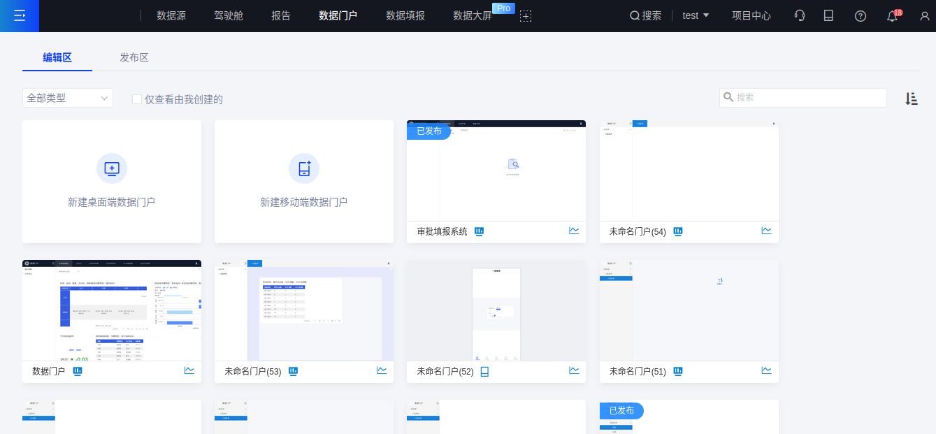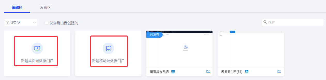 点击“新建桌面端数据门户”或“新建移动端数据门户”,即可新建桌面端或移动端数据门户,编辑操作请参见新建数据门户;