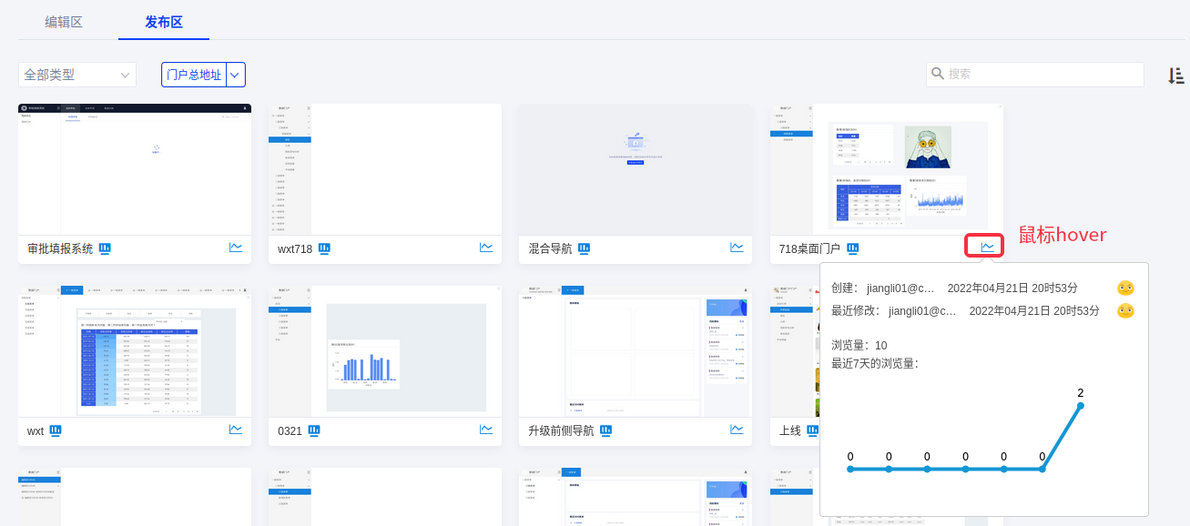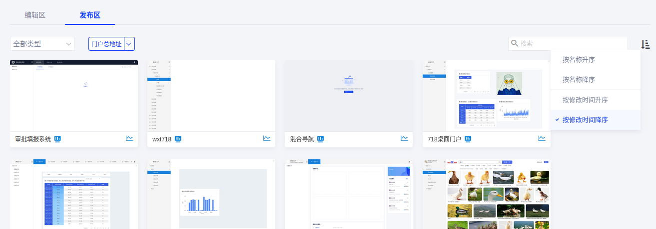 在发布区可以预览已经发布的数据门户,根据门户类型或直接搜索所需的数据门户,也可以根据名称或修改时间来对数据门户进行排序;