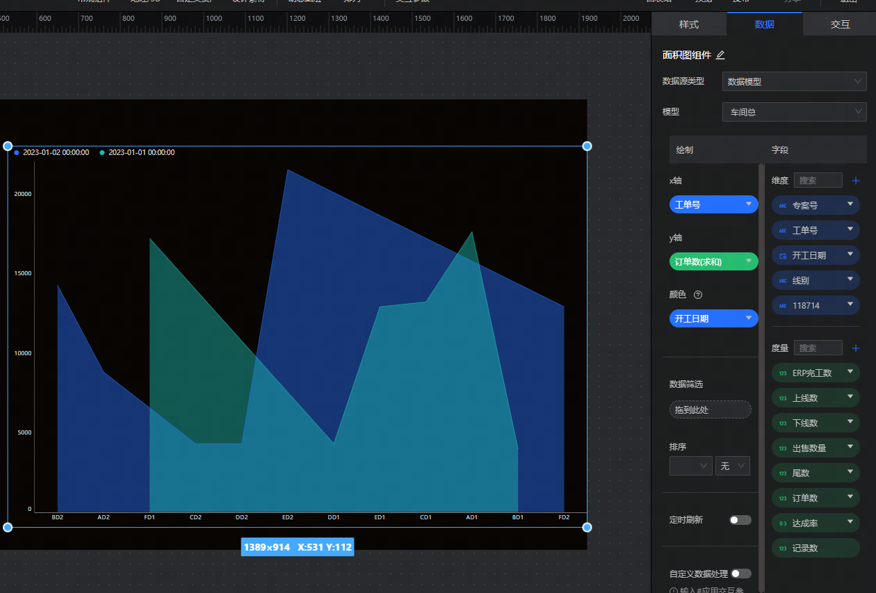 • x轴:设置x轴的维度字段,如下图中的“工单号”字段。