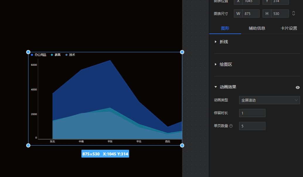 • 提示框:设置面积图提示框文字、背景、指示器及是否开启轮播。