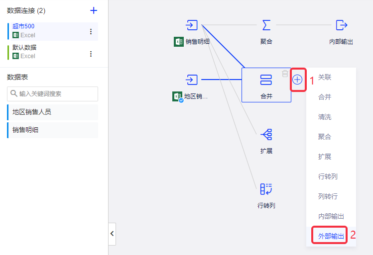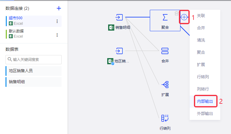 (1)点击已有的表,弹出“+”按钮,点击按钮,选择“内部输出”。
