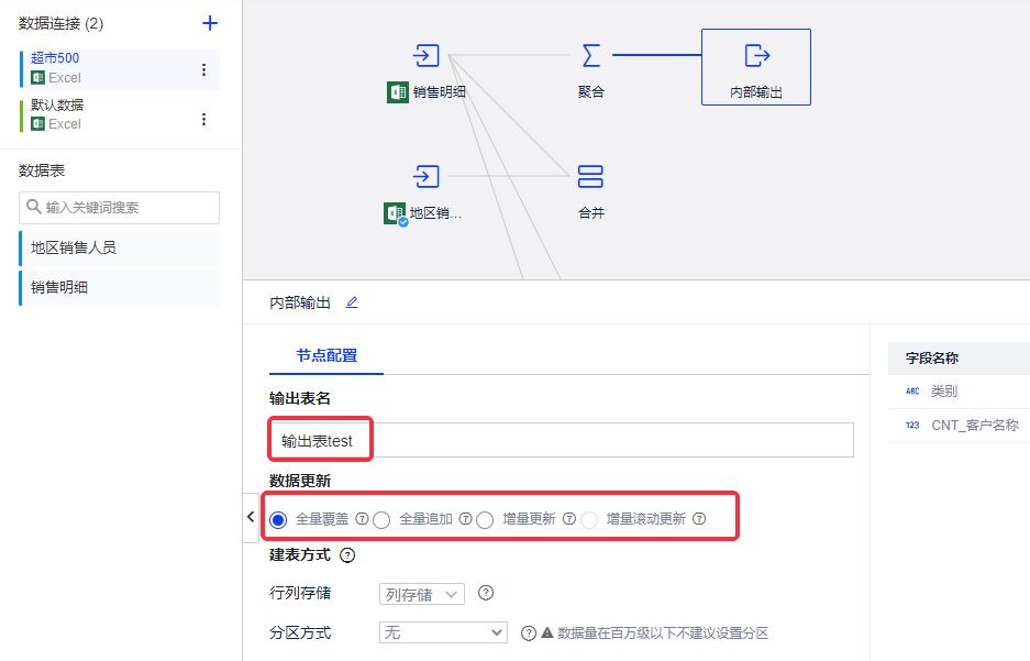 (2)在下方配置区域,您可以设置输出表名和数据更新方式。