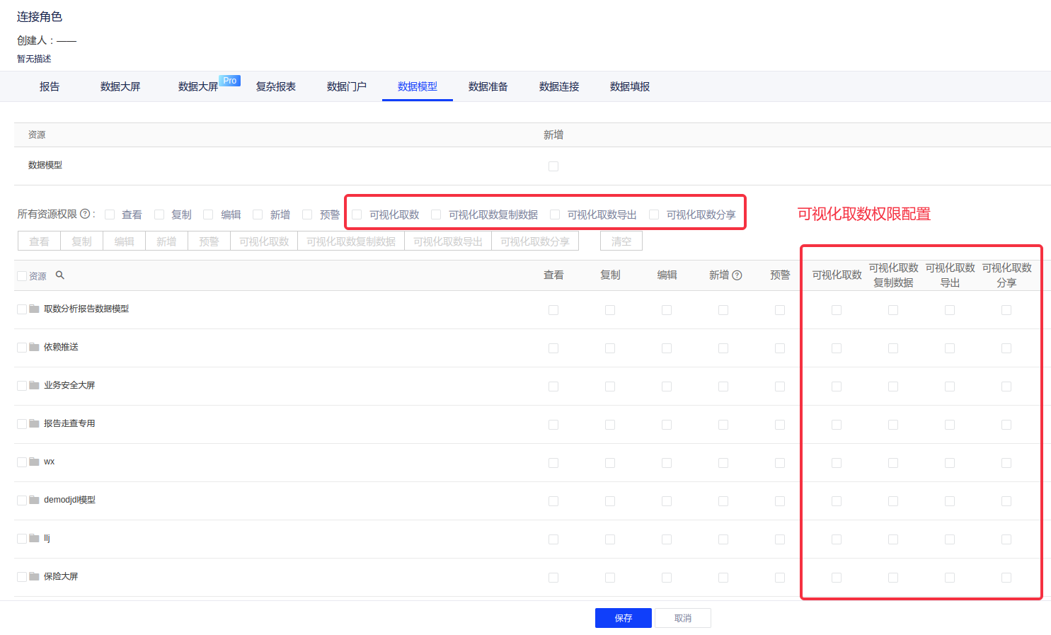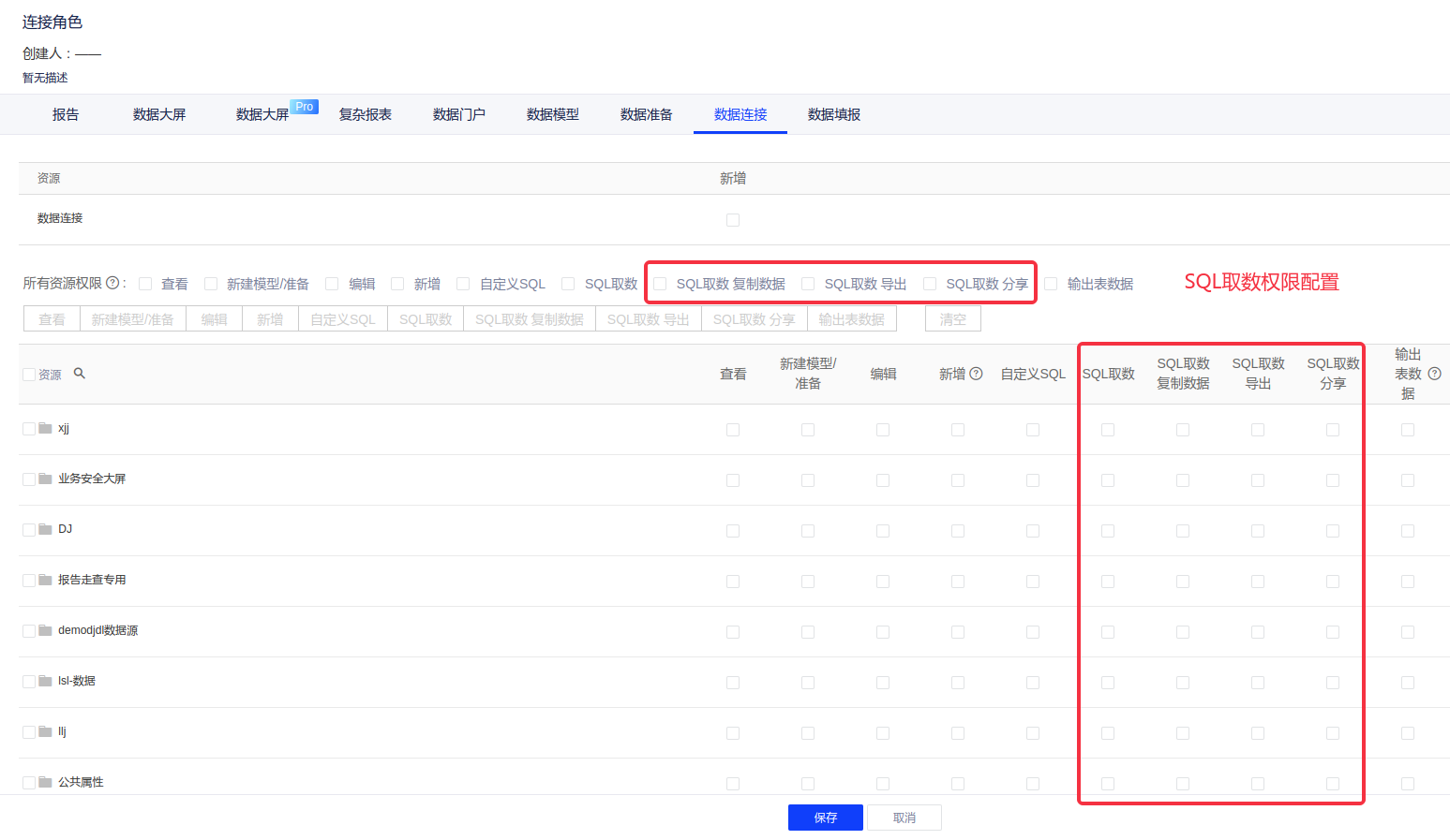 您可以在角色管理中配置自助取数的分享、导出功能的权限
