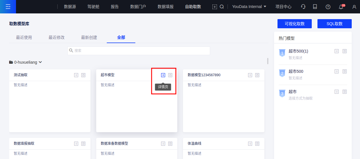 (1)进入自助取数模块,在模型库首页查找所需模型,或者选择右侧推荐栏的热门模型,点击模型卡片的【详情页】按钮,进入该模型的详情页界面;
