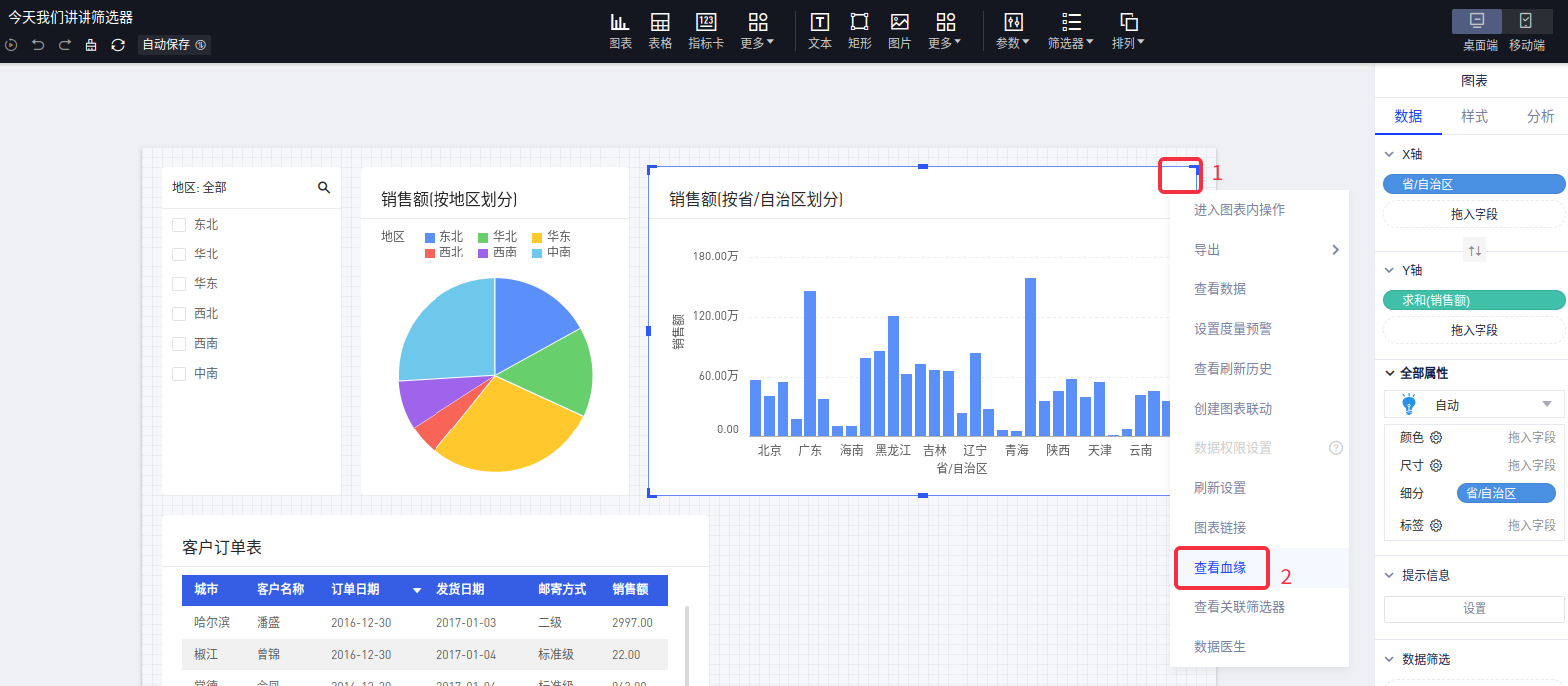 (2)当您在编辑报告时,点击图表右上角更多操作按钮,也可以进入血缘管理,快速查看该图表所使用的数据表、字段。