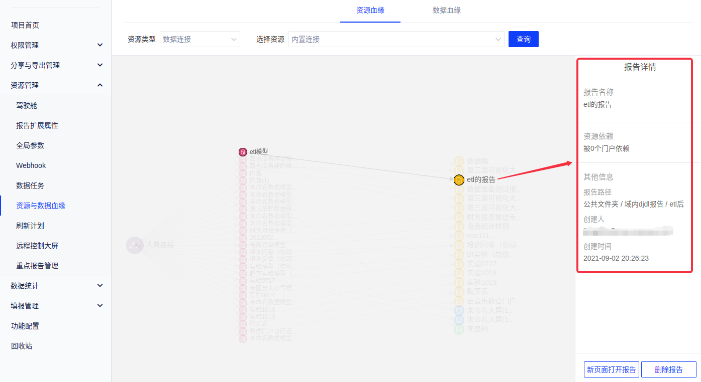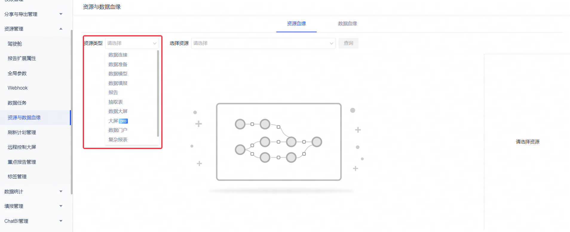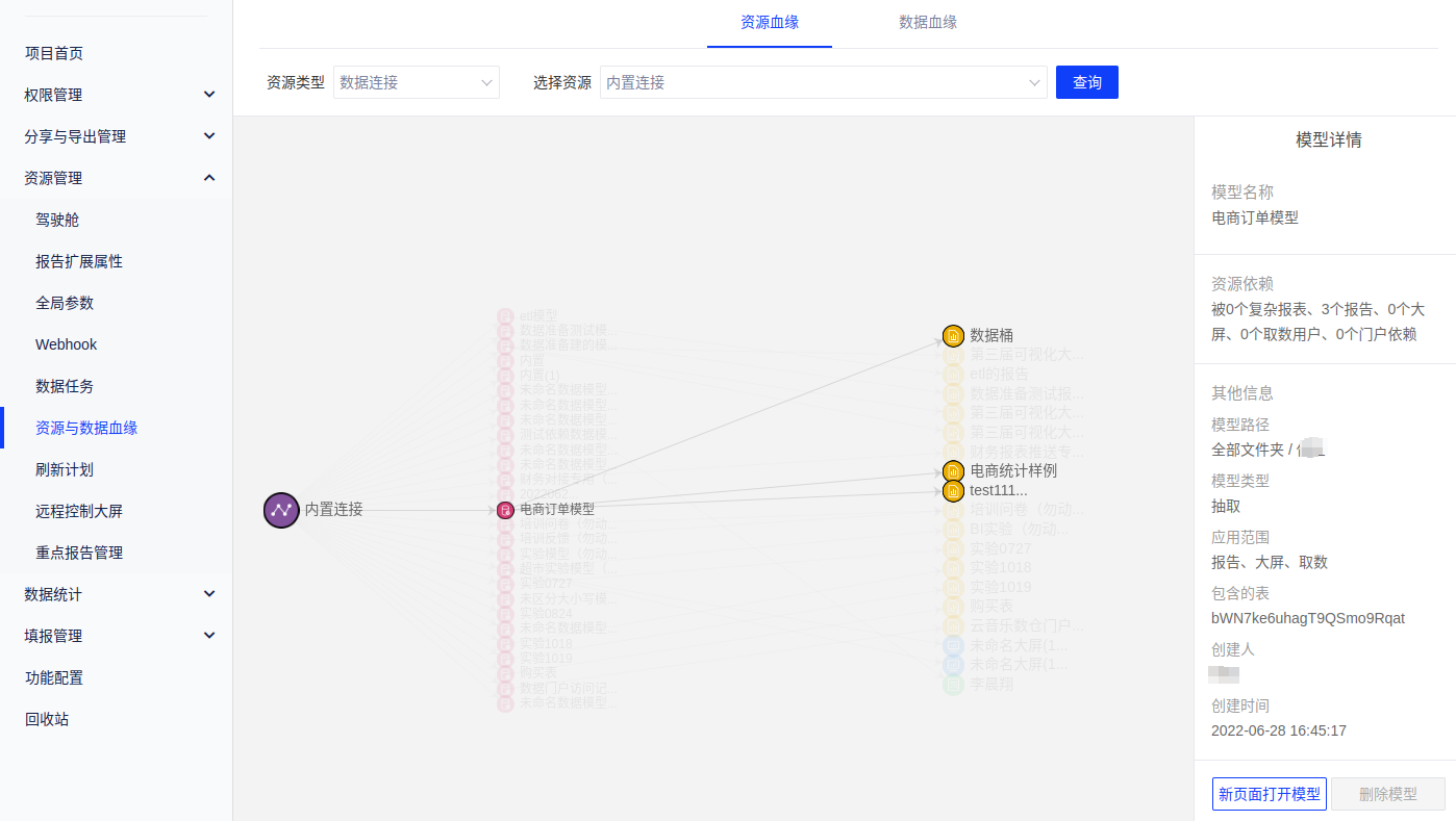 (3)资源类型可以查看数据连接、数据准备、数据模型、数据填报、报告、抽取表、大屏、数据门户和复杂报表的相关血缘关系。