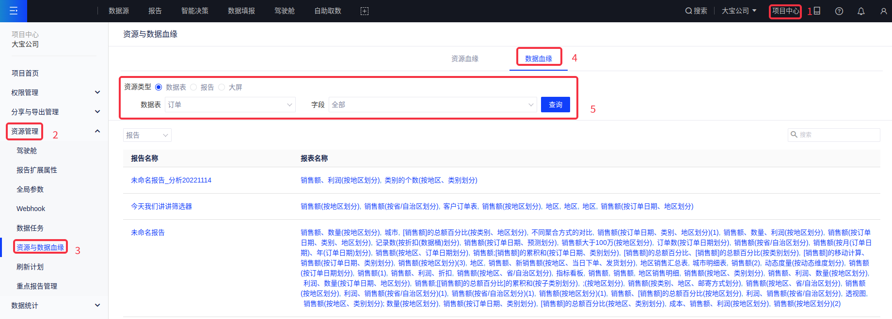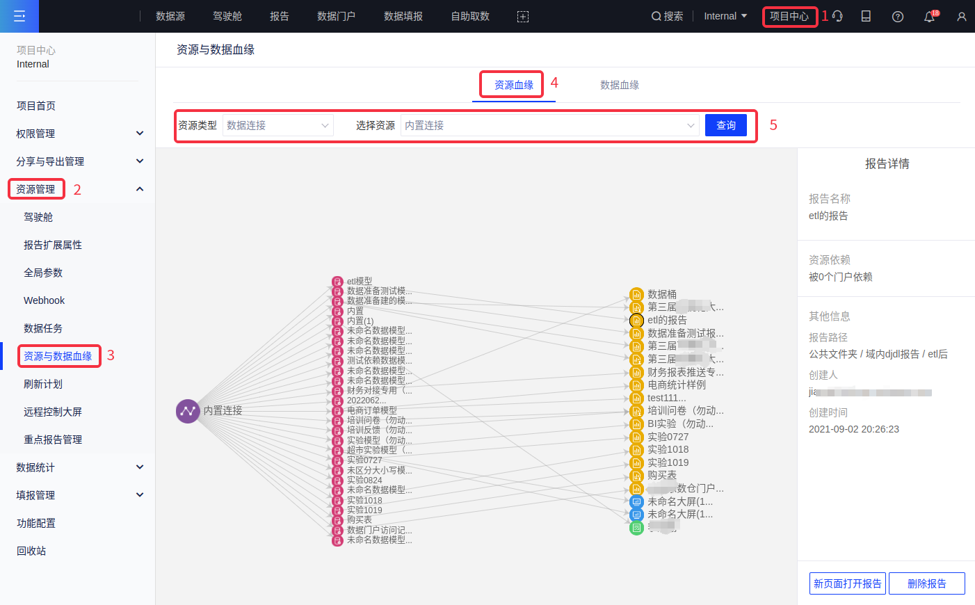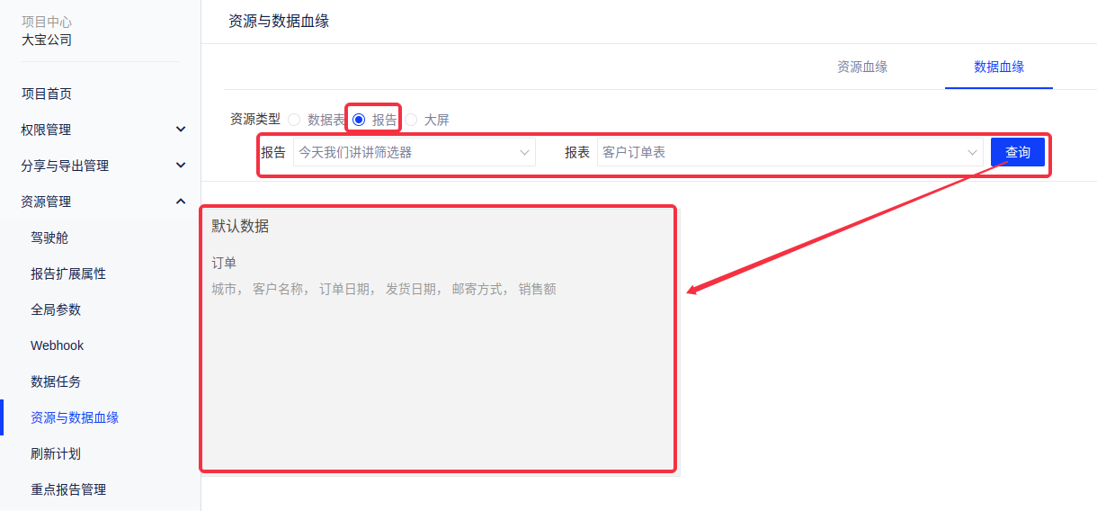 (3)资源类型可以查看数据连接、数据准备、数据模型、数据填报、报告、抽取表、大屏、数据门户和复杂报表的相关血缘关系。
