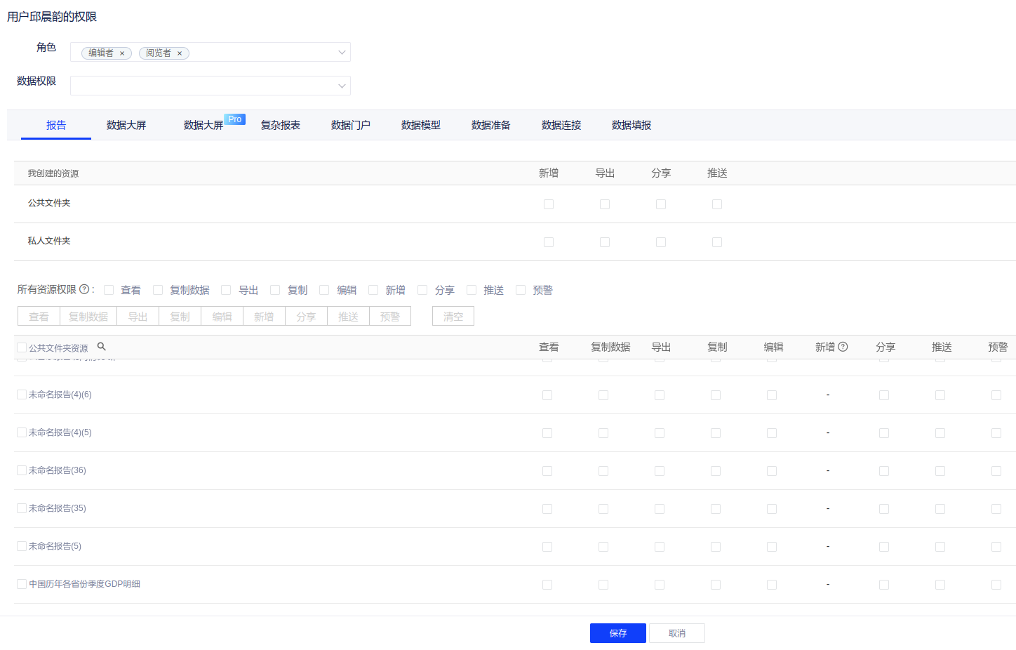 用户最终权限是用户从其所拥有的角色、用户组、部门继承的权限与资源权限的并集。如用户没有A报告的查看权限,但角色B拥有,而用户刚好拥有角色B,那么用户依然可以看到A报告。