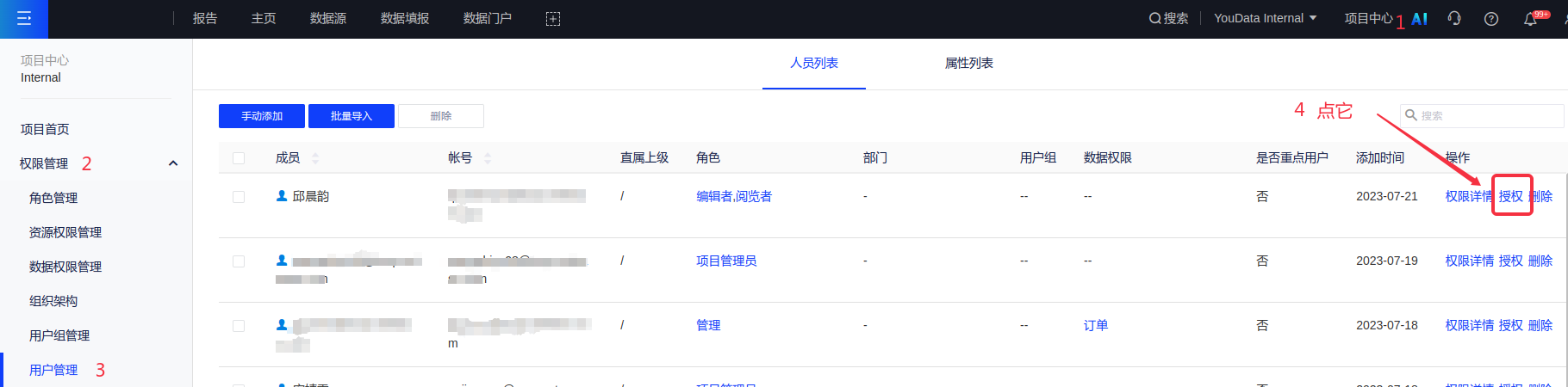 (1)需要具备项目管理员权限,依次点击项目中心-权限管理-用户管理,然后在用户列表中选择需要授权的用户,然后点击【授权】按钮;