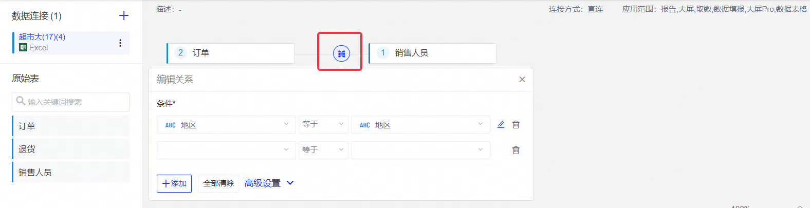关联时,您可以在此处配置逻辑表的基数和引用完整性。例如下图,“订单表”和“销售人员表”关联时,基数用来度量“订单表”中,公共字段“地区”的值在“销售人员表”中可以对应的行的数量;引用完整性用来度量“订单表”的行在“销售人员表”中是否具有匹配行。