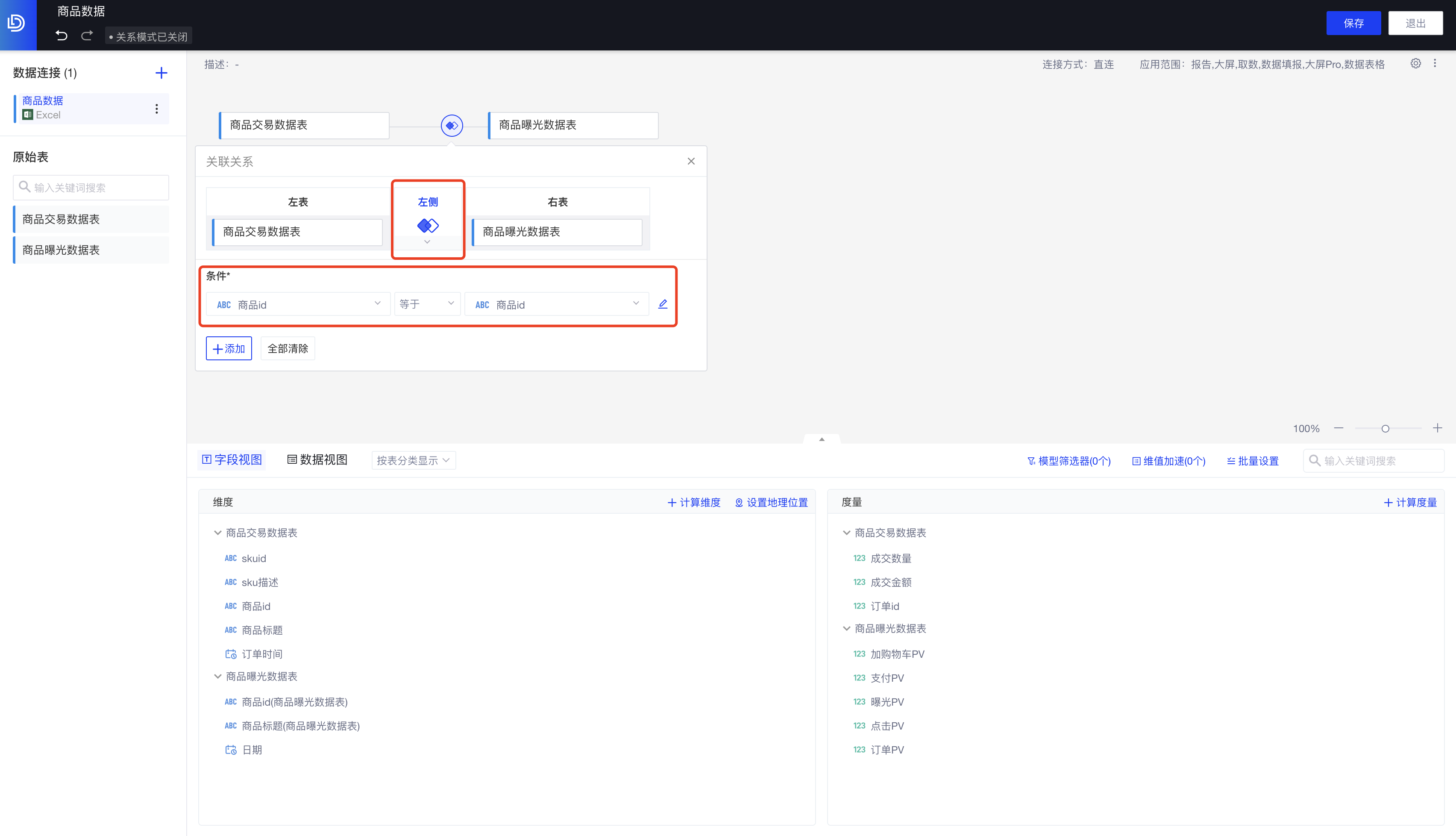 步骤2:拖入要分析的“商品交易数据表”、“商品曝光数据表”