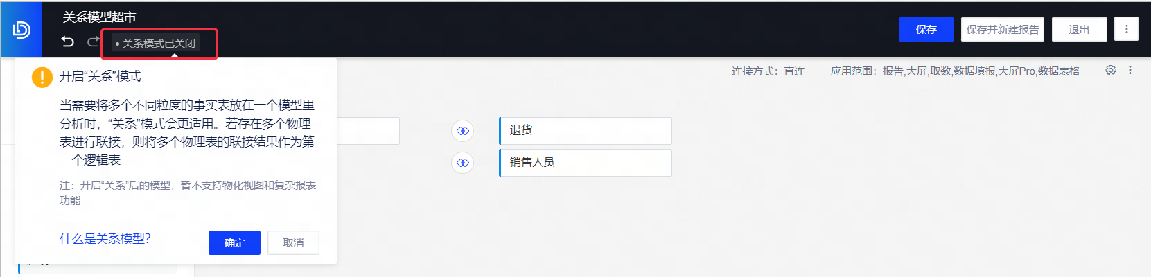 在数据模型编辑界面左上角开启关系模式,显示关系模式已开启,数据模型进入两层结构:第一层关系;第二层联接。
