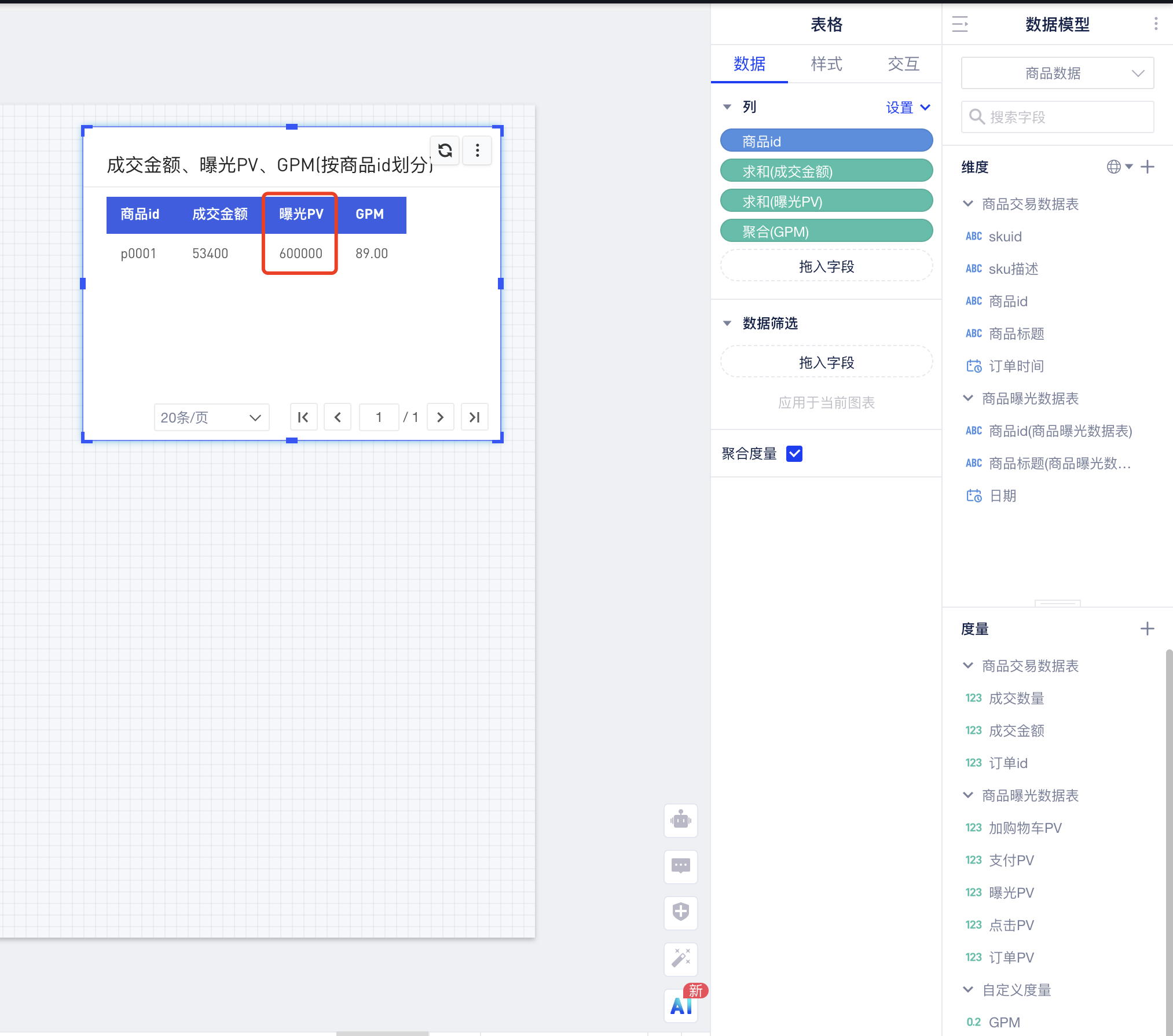 拖入商品id、成交金额、曝光PV和GPM,可以发现曝光PV指标展示的值是正确的,未发生数据膨胀,由此得到了正确的GPM: