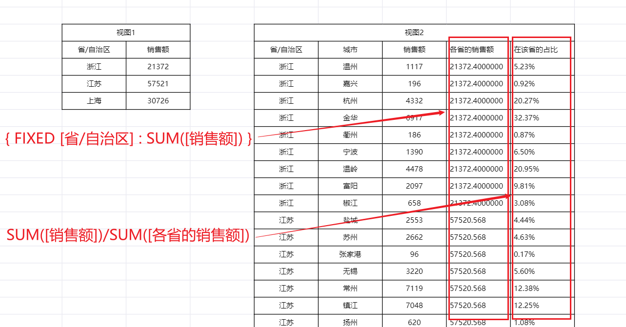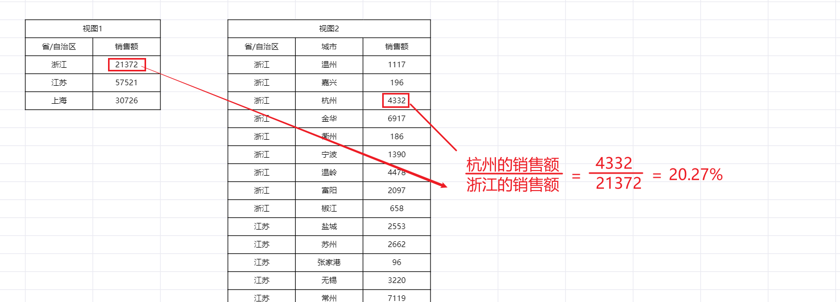 例1:还是上文的视图1跟视图2,当我们需要在视图2里加一列数据,显示每个城市销售额在该省的占比,比如计算杭州的销售额占浙江省的比例,这时候我们需要“杭州的销售额/浙江的销售额”,但杭州的销售额数据在视图2里,而浙江的销售额数据在视图1里。没法拿到一起计算: