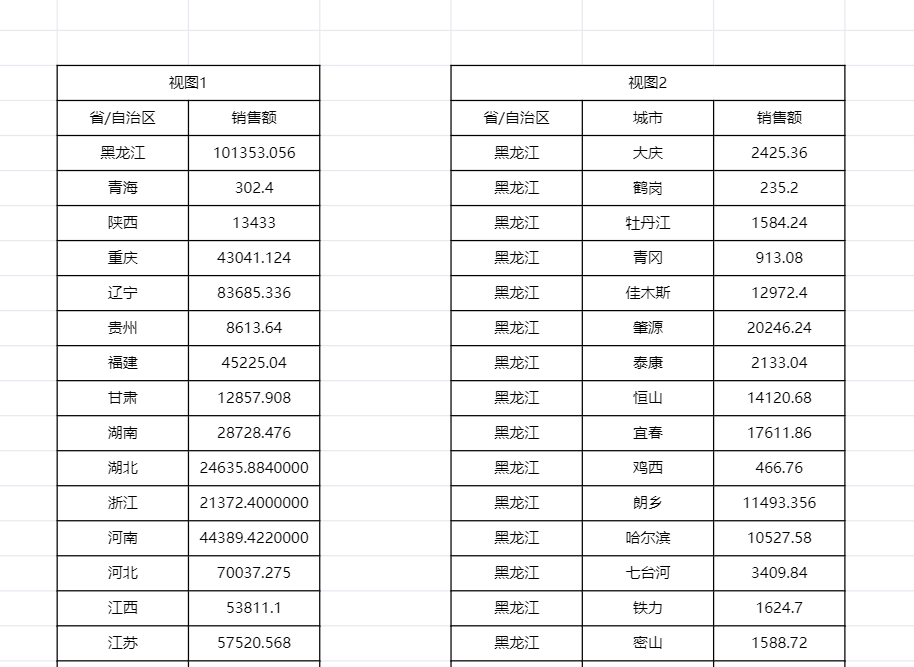 2、视图:数据库技术里有对视图的定义,本文中,可以先简单地把视图理解为一个表格,如下图所示就是两个不同粒度的视图,视图1 细化到省,视图2细化到城市,视图2的细化程度更高,数据更明细,包含的信息也更多: