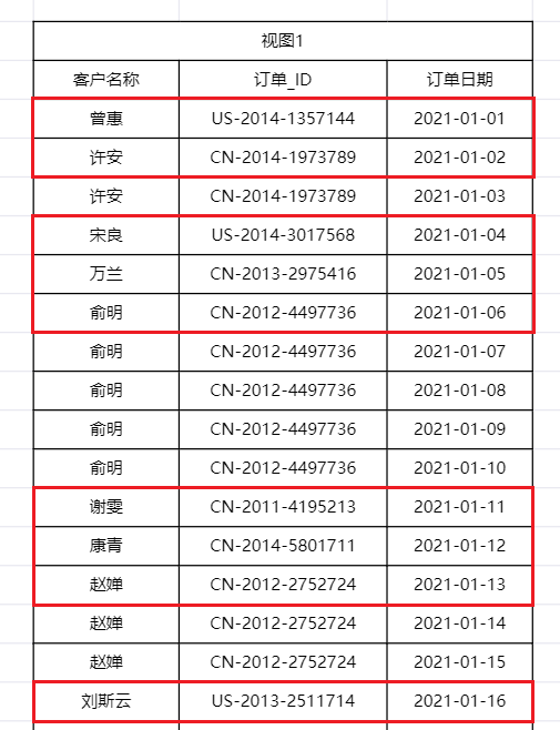 这时候,如果我想给每个订单打个标签,标记这个订单是否是新客户的首单(一个新客户下的第一单就被认为是首单),如图中标出的几个订单: