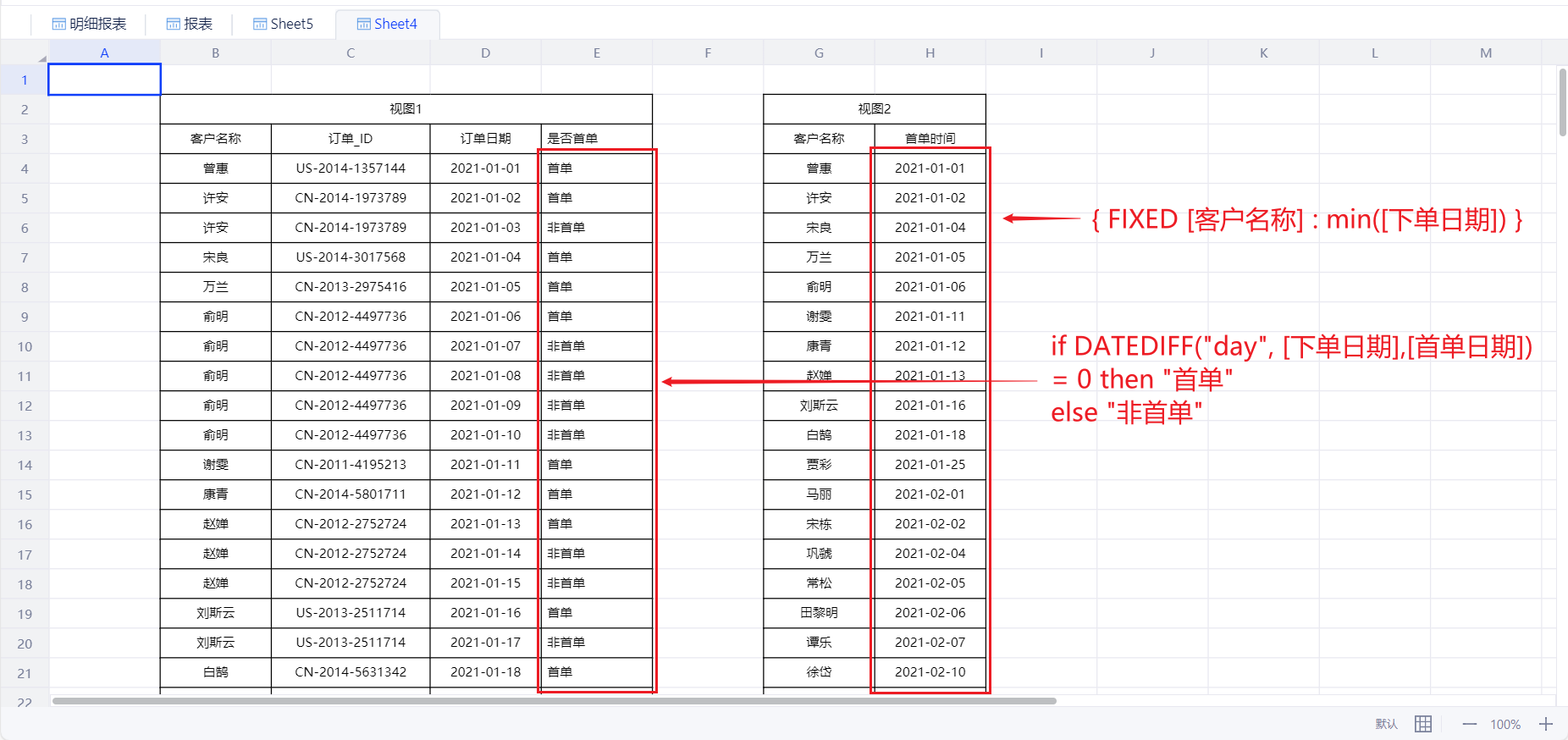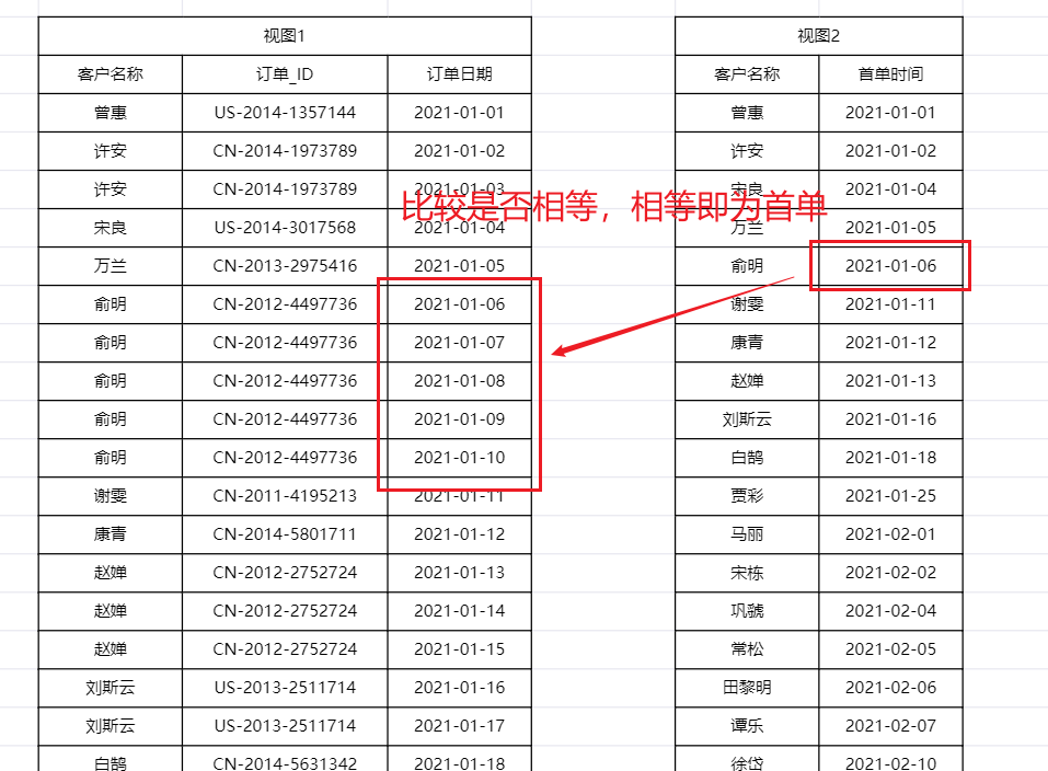 得到每个客户的首单日期后,我们只要把每个订单的日期去跟首单日期比较,如果相等就是首单,但现在遇到了难题,要比较的两个数据来自不同粒度的视图: