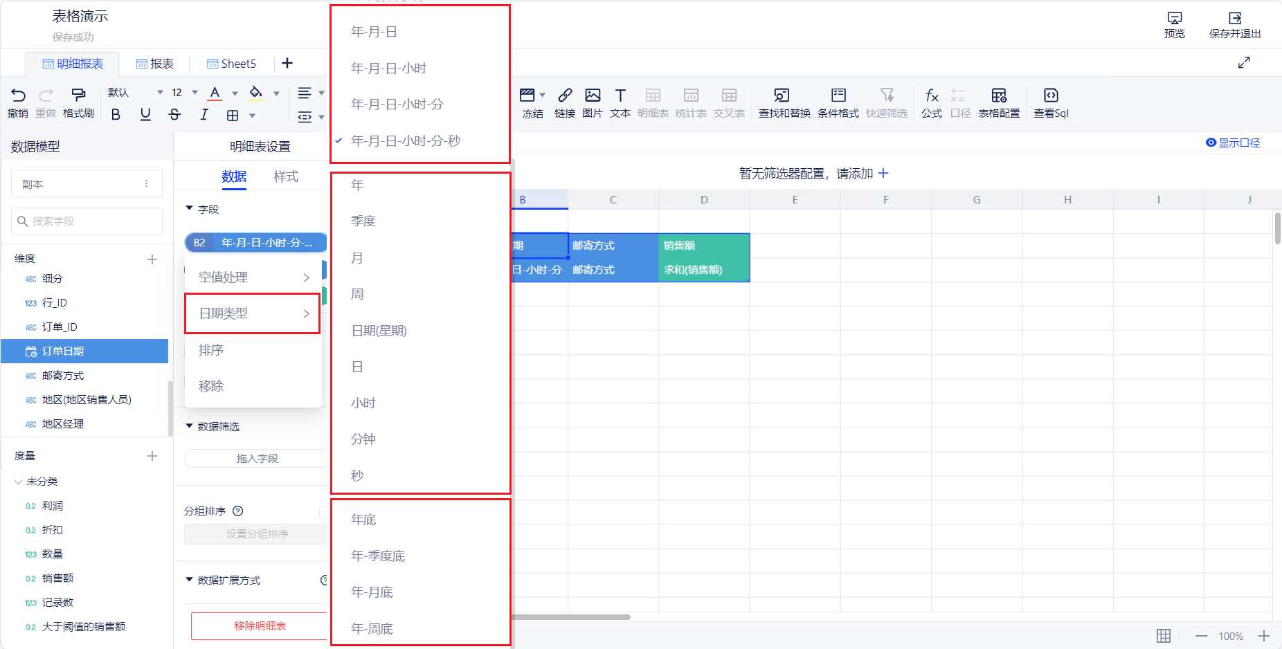 数据表格中支持多种日期类型,不同的日期类型通常代表的不同的粒度,可通过表计算功能实现跨视图粒度计算。