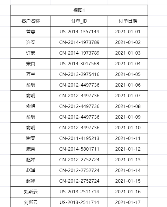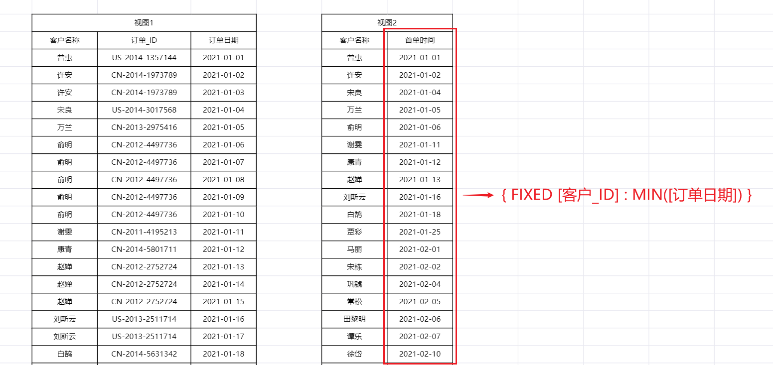 例2:再举一个跨视图粒度计算的例子来帮大家理解,假设我们有这样一个视图,记录客户每个订单发生的时间,粒度细化到每个订单: