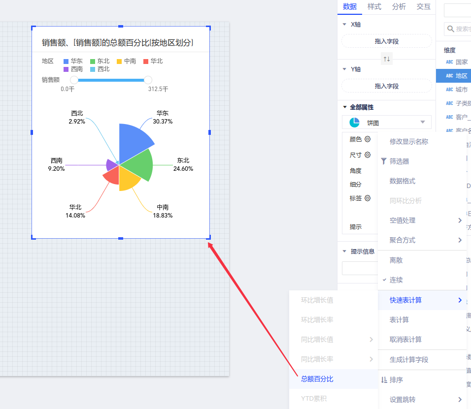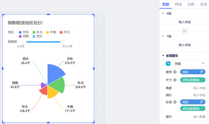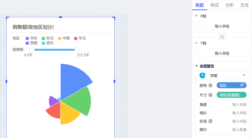 以默认数据模型为例,查看地区的销售额占比情况,将涉及到2个字段:维度“地区”,度量“销售额”。