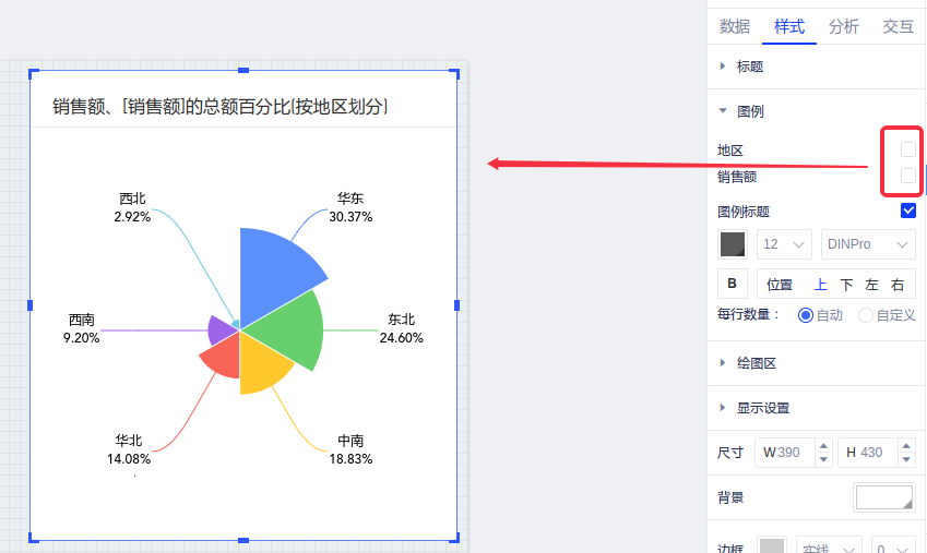 (6)最后在样式面板中可将“地区”、“销售额”的图例隐藏,得到初步的玫瑰图。