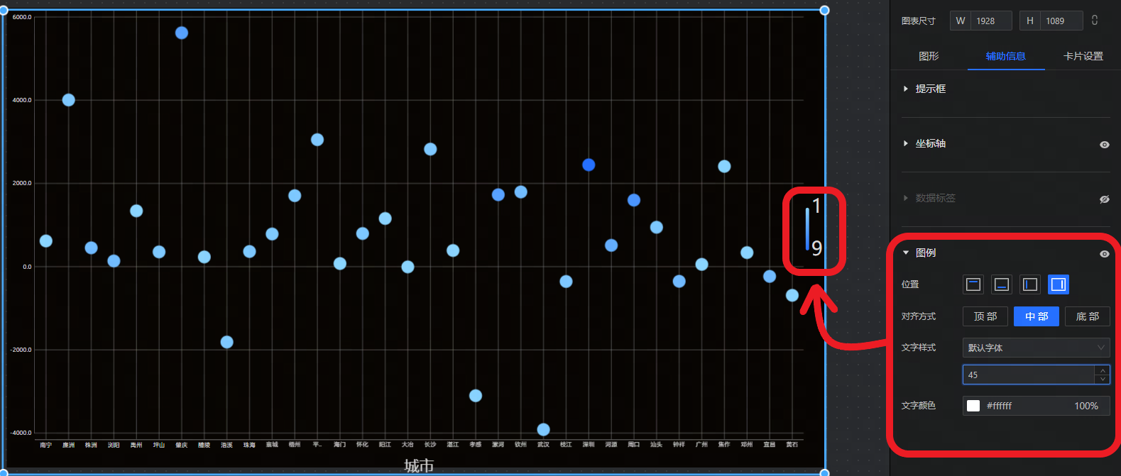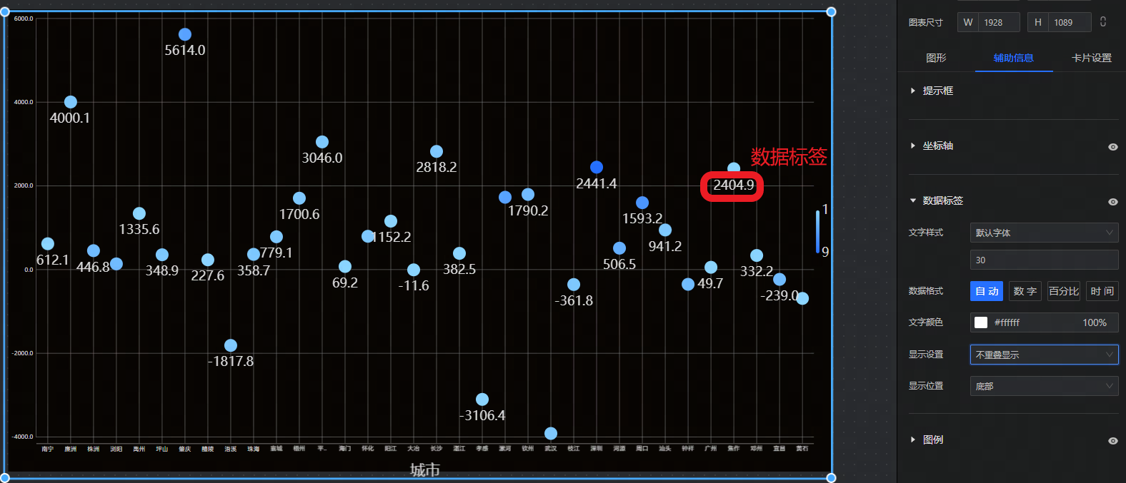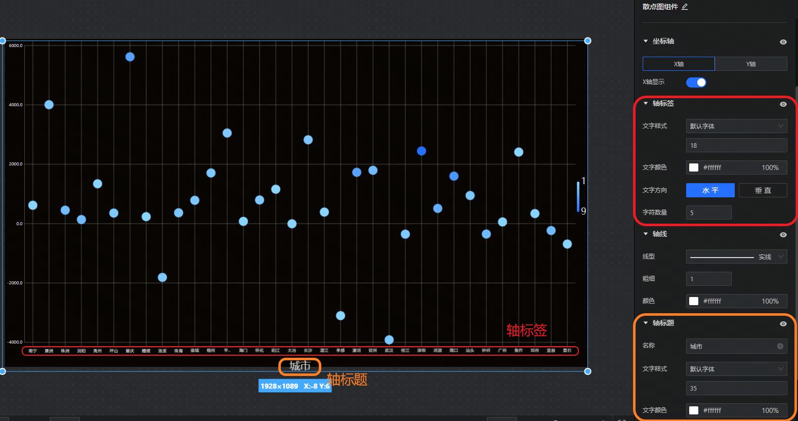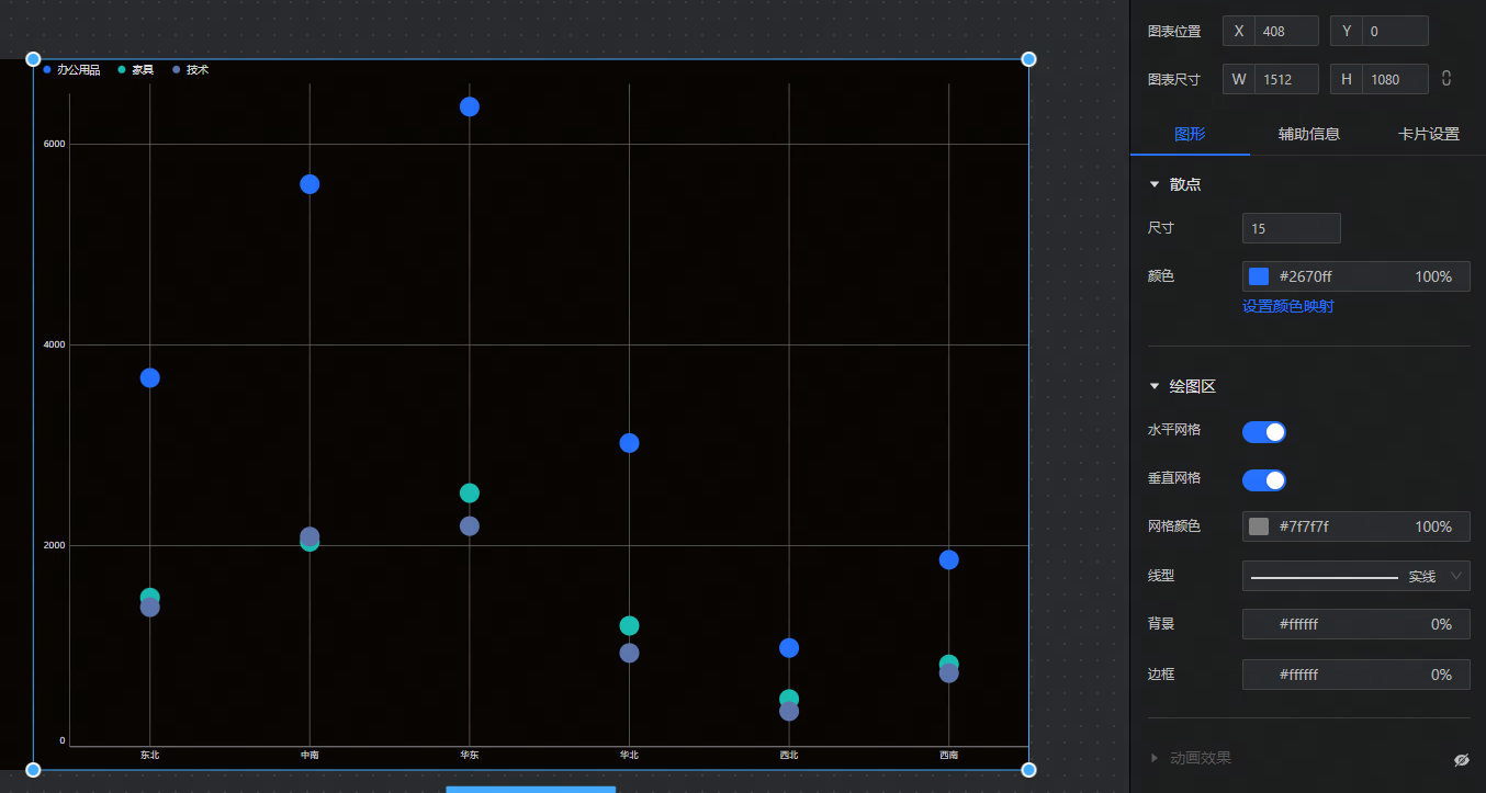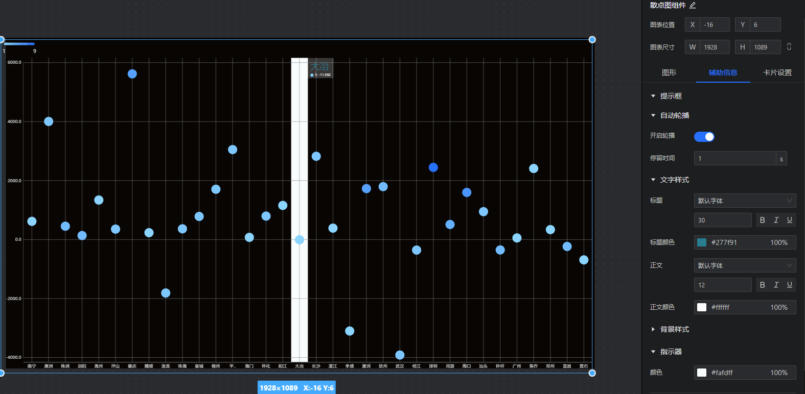 • 提示框:设置散点图提示框文字、背景、指示器及是否开启轮播。