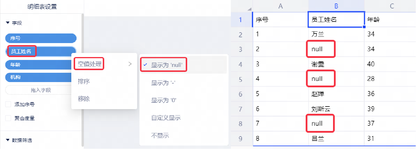 - 右键单击配置区中的字段,选择“空值处理”,选择需要的空值显示格式即可。