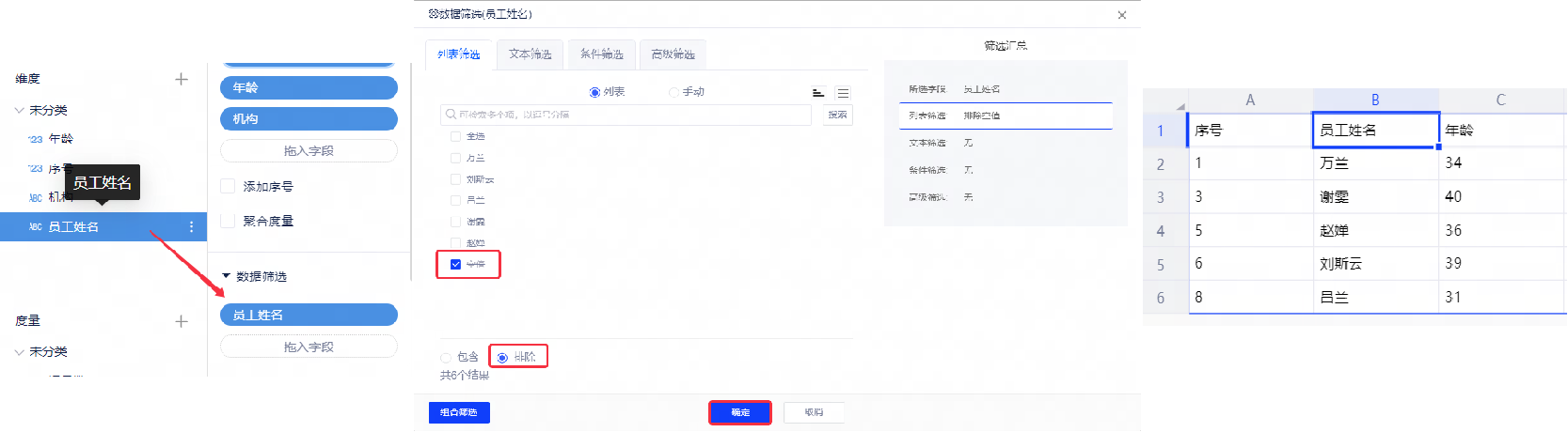 - 将字段拖入数据筛选维值,在弹出的配置窗口中勾选“空值”后点击“排除”,即可不显示该字段为空的样本数据。