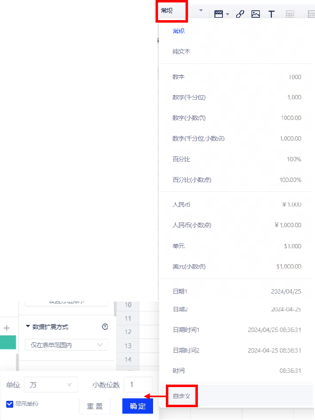 - 可设置小数位数、纯文本、常规、日期、数字、时间等常见格式,还能够根据不同货币的需求选择相应的格式。此外,用户也可自定义数字格式。