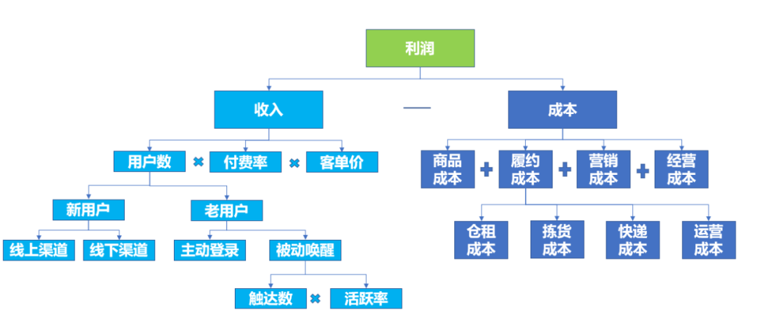 杜邦分析是最常用的分析方法之一,通过问题的层层拆解、分析,确定每一层次的表现情况,帮助最终分析出问题的主要矛盾。最常见的就是电商的利润模型,可见下图,在按公式、结构的拆解后,可以清晰的定位到【利润】变化的主要原因和次要原因: