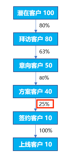 流程化的分析方法,观察流程节点间的转化率情况,做出分析判断。常用的如电商访问下单流程、2B销售流程等,通过观察每个节点间的转化率,判断某个环节是否出现异常。如下图的2B销售漏斗图,在签约客户环节转化率是25%,较低,可能是客户对方案满意度低,需重点关注产品方案问题。