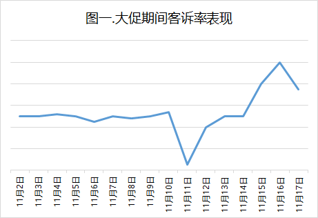 但是11月11日发生的客诉单,并不一定是在11月11日支付的,可能是11月10号,9号,8号,甚至更早之前。因此分子和分母研究的订单并不是同一拨。以及会出现客诉量跟以前差不多,但是支付订单量在双11期间会有一个比较大的涨幅,在这一天整体的客诉率会有一个比较明显的下降,然后再后一段时间,比如11月15号,用户陆续收到货了,双11期间的订单客诉起来了,但是对应的分母部分订单量回到了正常水平,导致了客诉率变得特别高,从而形成了如下图的变化趋势。