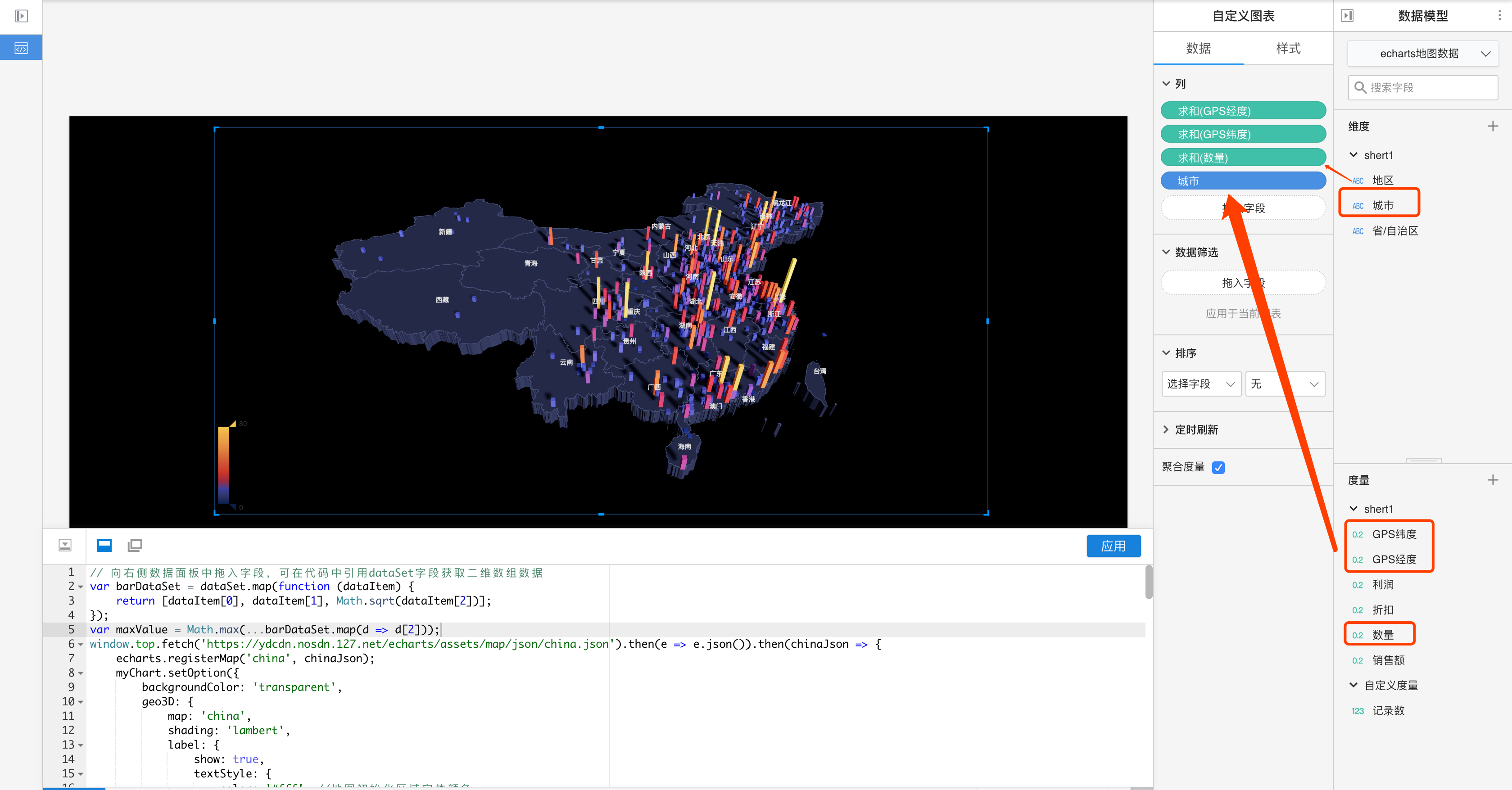 将经纬度数据、想要展示的度量值,和地理坐标对应的城市名称维度拖入数据面板,然后利用外部请求获取地理位置信息,加上刚刚引入的数据,通过echarts gl绘制如下3D地图: