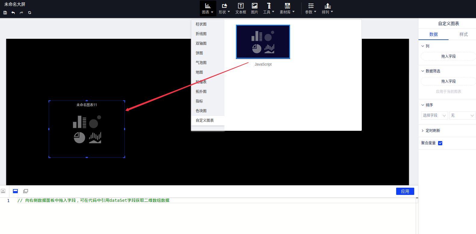 利用大屏的自定义图表控件,编写JavaScript绘制自定义图表的过程与报告相同,这里给一个echarts 3D地图的案例。