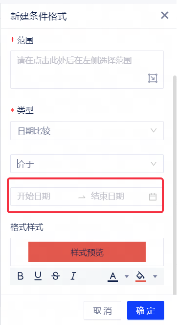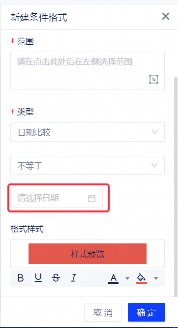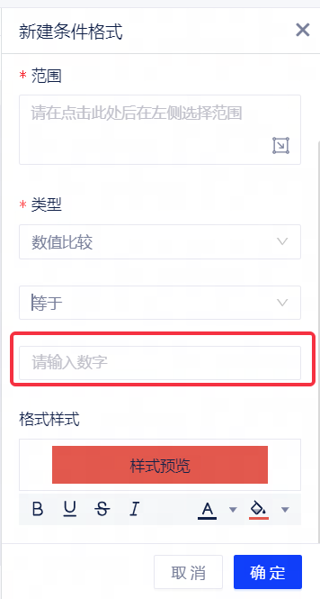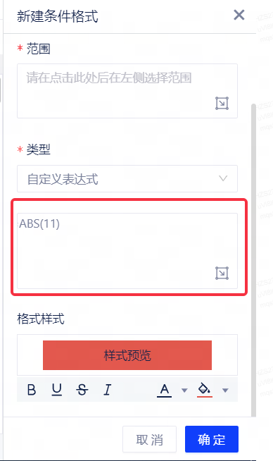 在选择类型为自定义表达式后,支持用户通过输入自定义公式配置条件格式,并对满足格式条件的单元格应用格式样式。