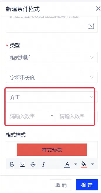 字符串长度:用户选择字符串长度子类型时,支持设置判断条件为“介于、不介于、大于、大于等于、小于、小于等于、等于、不等于”,并自定义范围。