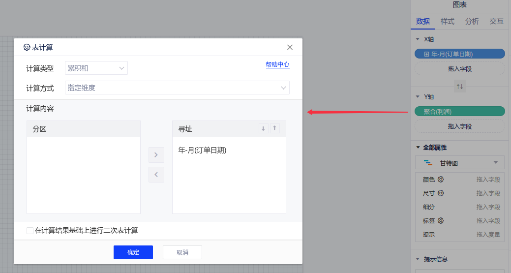 (3)创建”累计和“表计算:右键y轴的【利润】字段,计算类型选择累计和,计算内容中,将【订单日期】移入寻址。对于表计算的详情介绍可移步这里查看。
