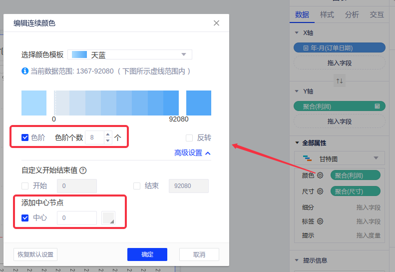 (5)设置瀑布颜色:将度量【利润】拖入颜色属性,开启色阶、高级设置-添加中心节点-中心值设置为0,这样可以更好的区分正负值;