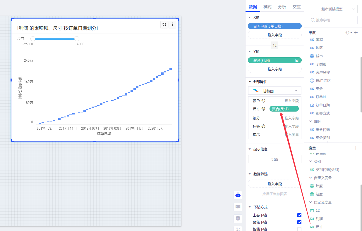 (2)将维度【订单日期】、度量【利润】分别拖入x轴和y轴;并将【订单日期】的日期类型改为“年-月”;