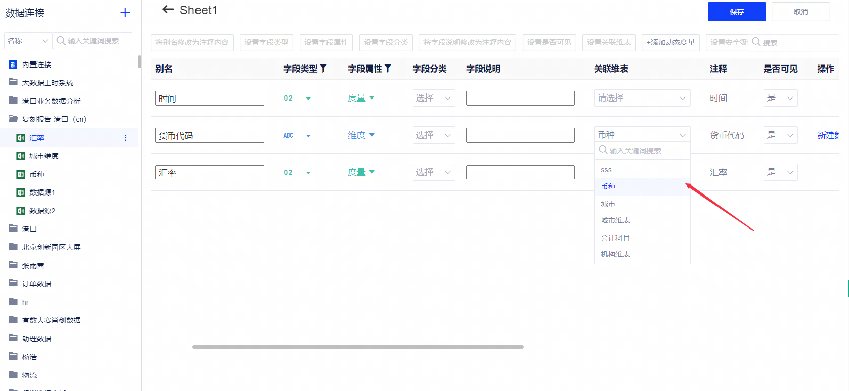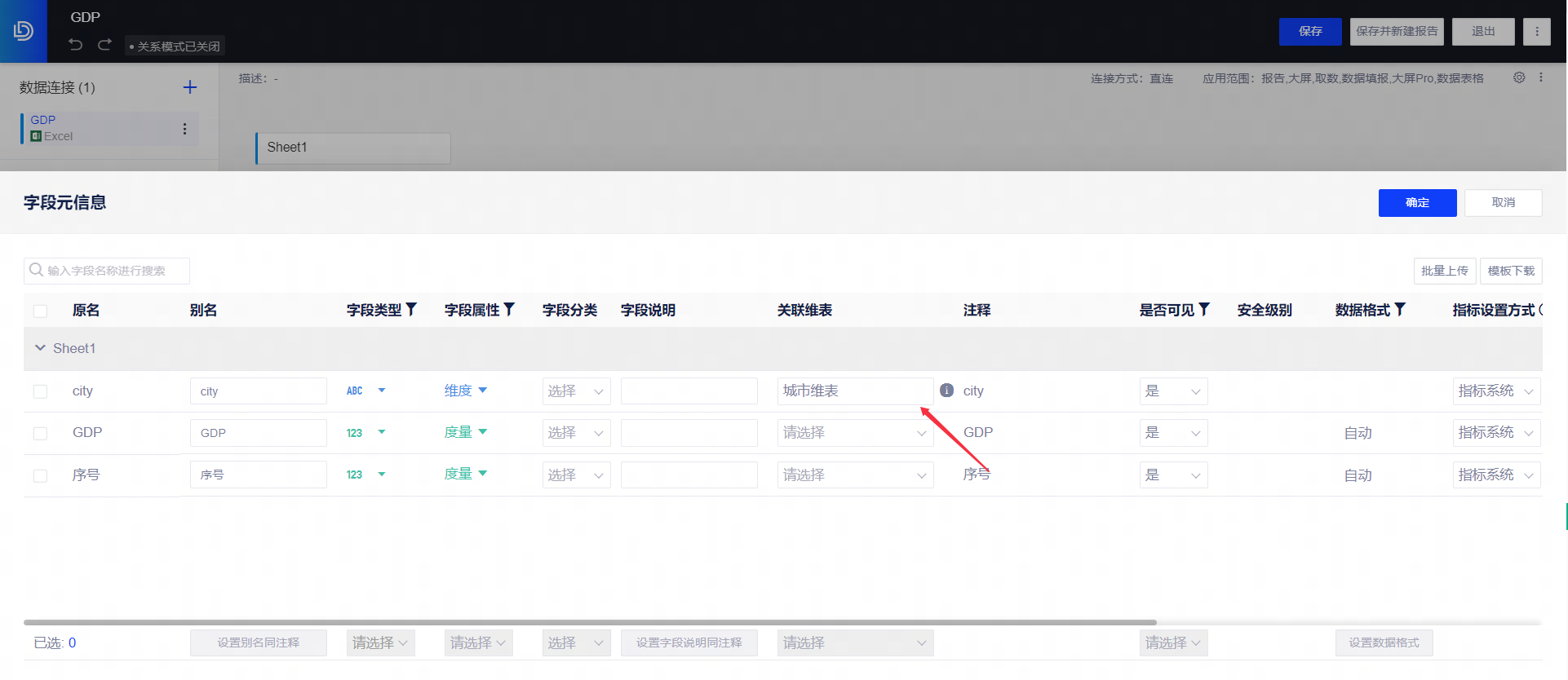 用户在数据连接的模型元信息设置页面为某字段匹配相应维表