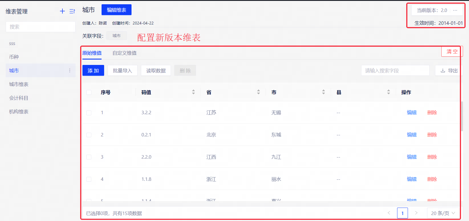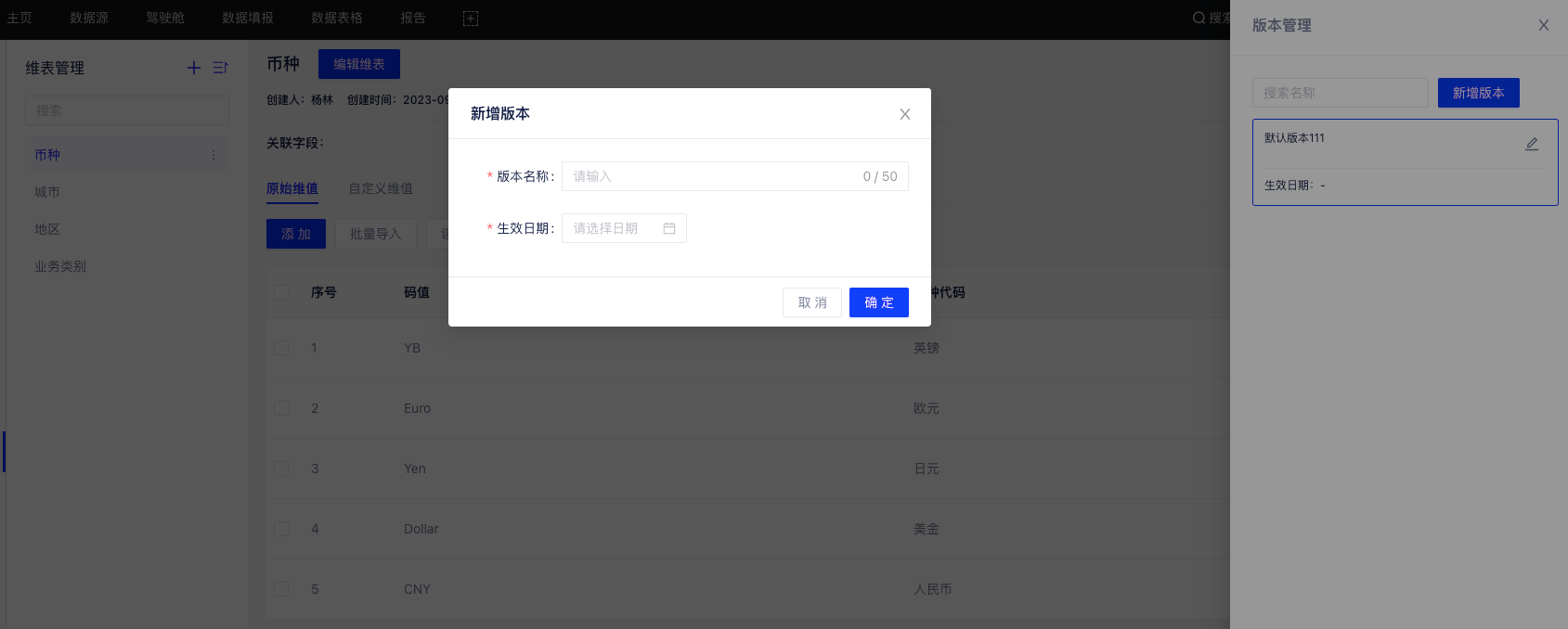 - 新增版本:日期筛选器选择对应时间,显示新增版本的维表信息