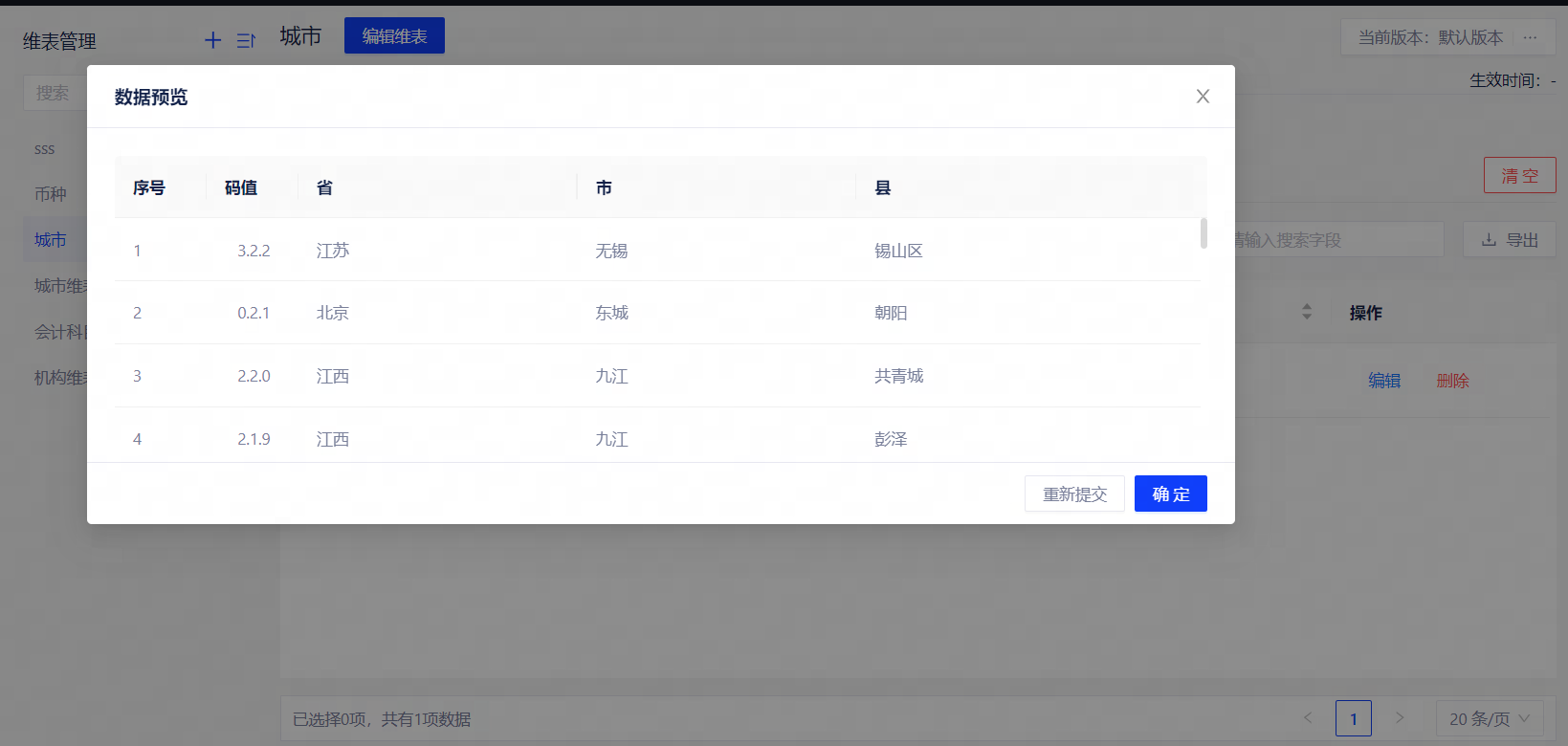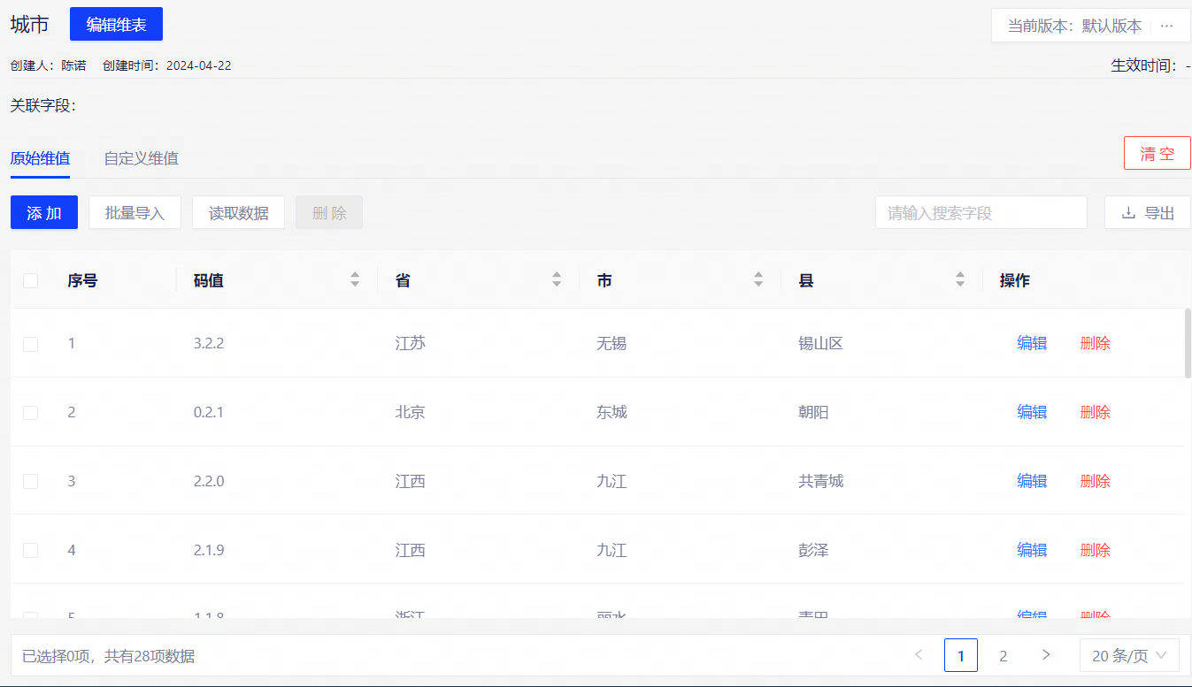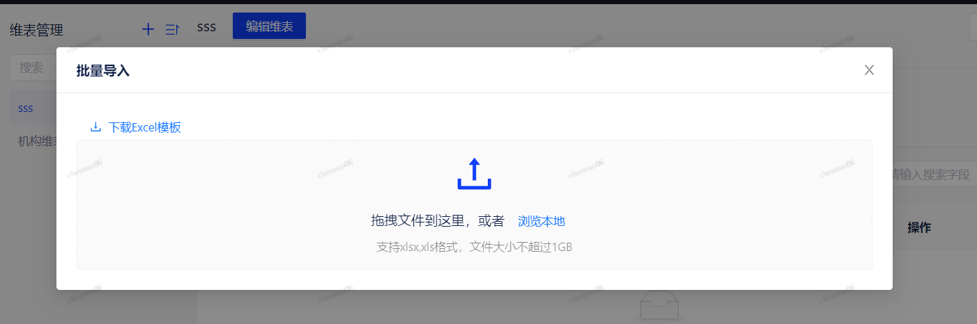 批量上传:使用Excel批量上传维度信息,系统采用码值作为主键做数据更新,数据中不允许码值重复