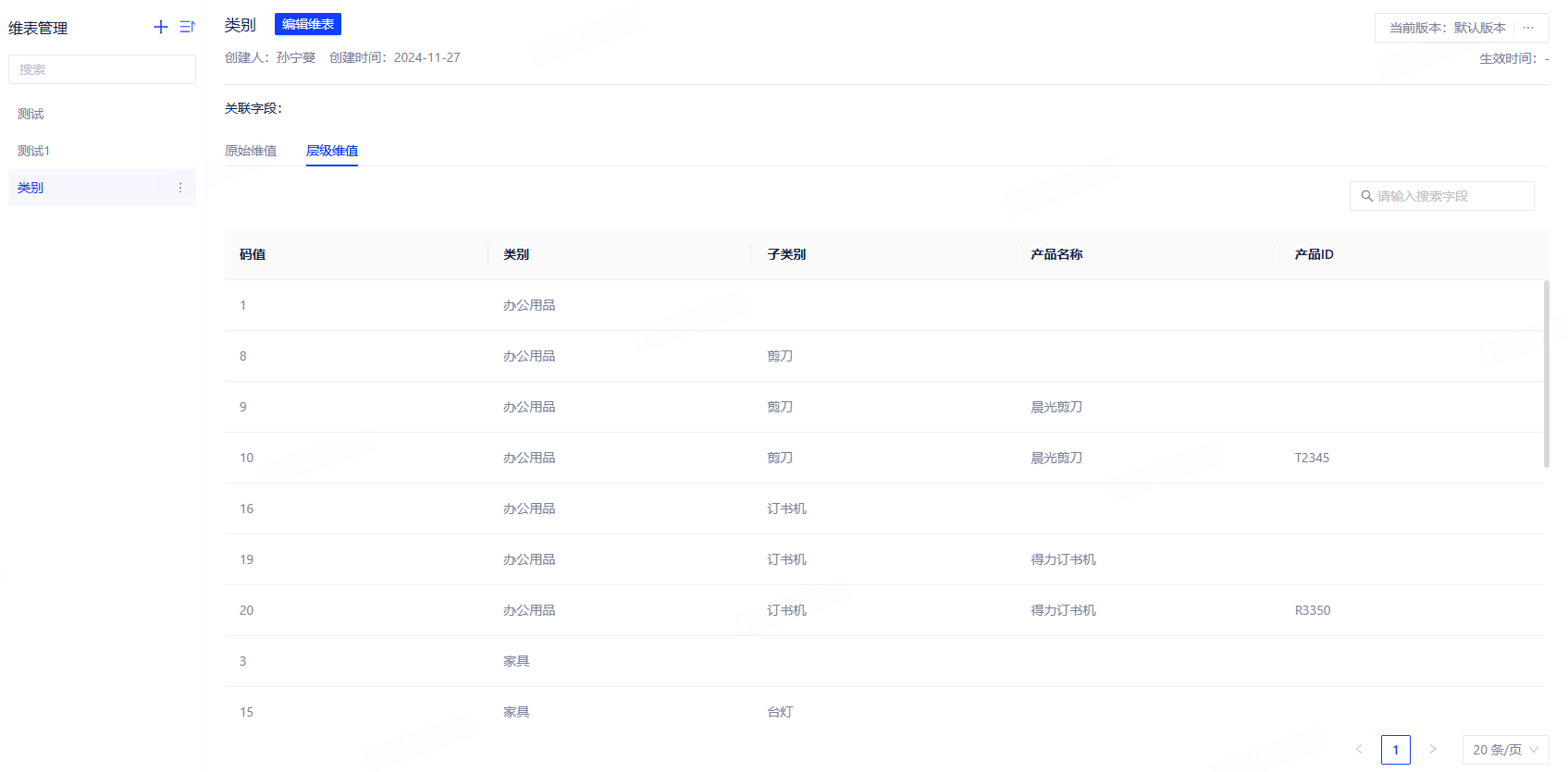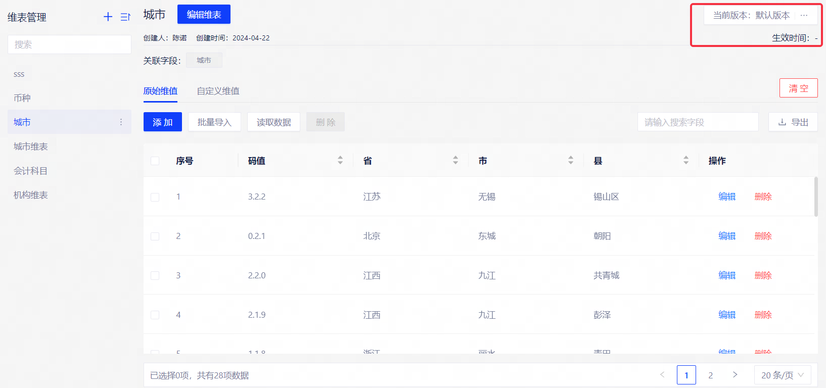 - 默认版本:日期筛选器设置为全部时间时,显示默认版本的维表信息