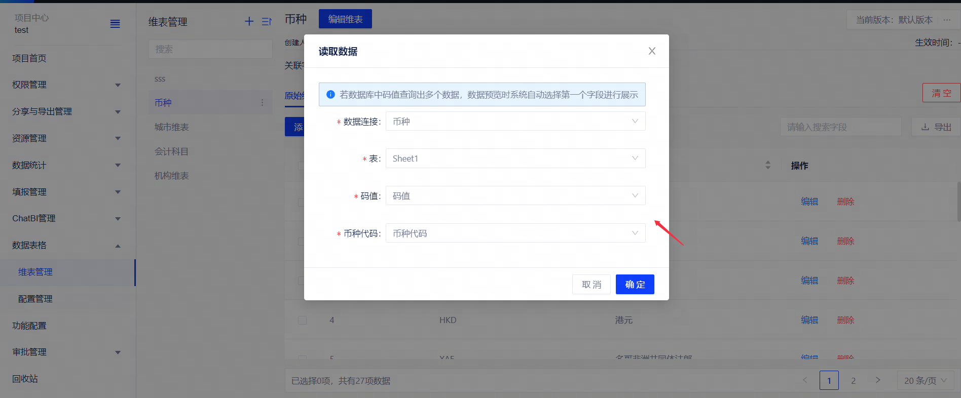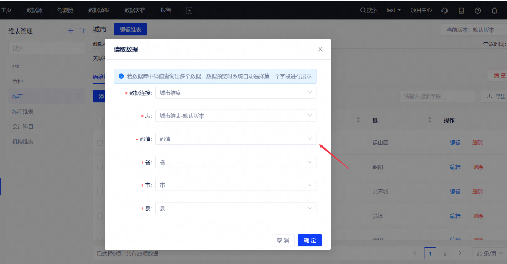 读取数据:将数据库中的维度信息读取到平台。需要在数据连接配置相关数据库信息,系统采用码值作为主键做数据更新,数据中不允许存在重复码值据